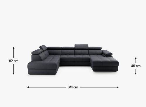 Lizbona III to przestronny narożnik stworzony z myślą o codziennym wypoczynku w dużym stylu. Jego imponujące wymiary – 341 cm szerokości i 200 cm głębokości – sprawiają, że świetnie sprawdzi się w przestronnych salonach, oferując dużo miejsca dla całej rodziny.