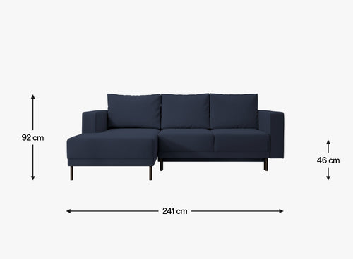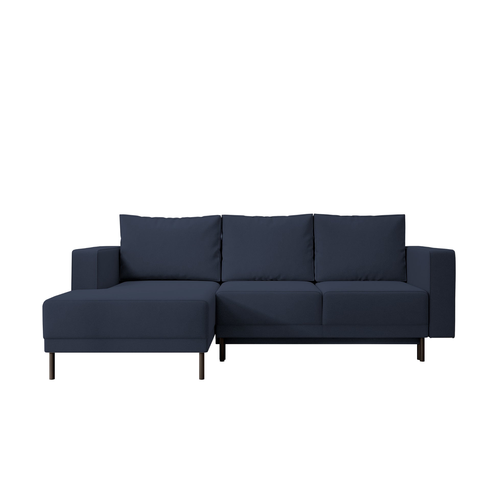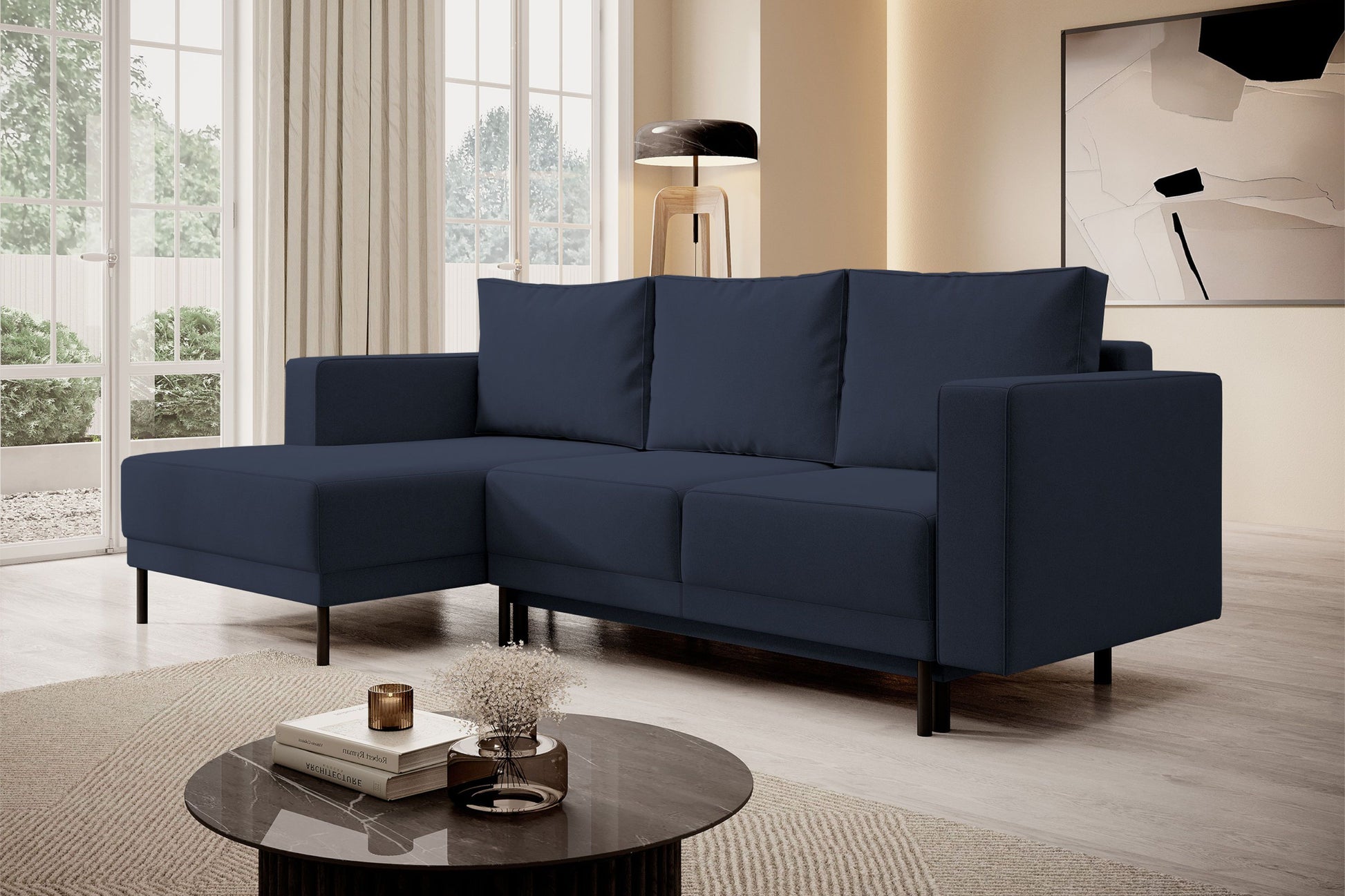Podniesiony na wysokich, smukłych nogach, mebel zyskuje lekkość wizualną, nie tracąc przy tym nic z solidności. Lewo, lub prawostronna orientacja narożnika sprawia, że świetnie wpasuje się w różnorodne układy pomieszczeń, podkreślając ich nowoczesny charakter.