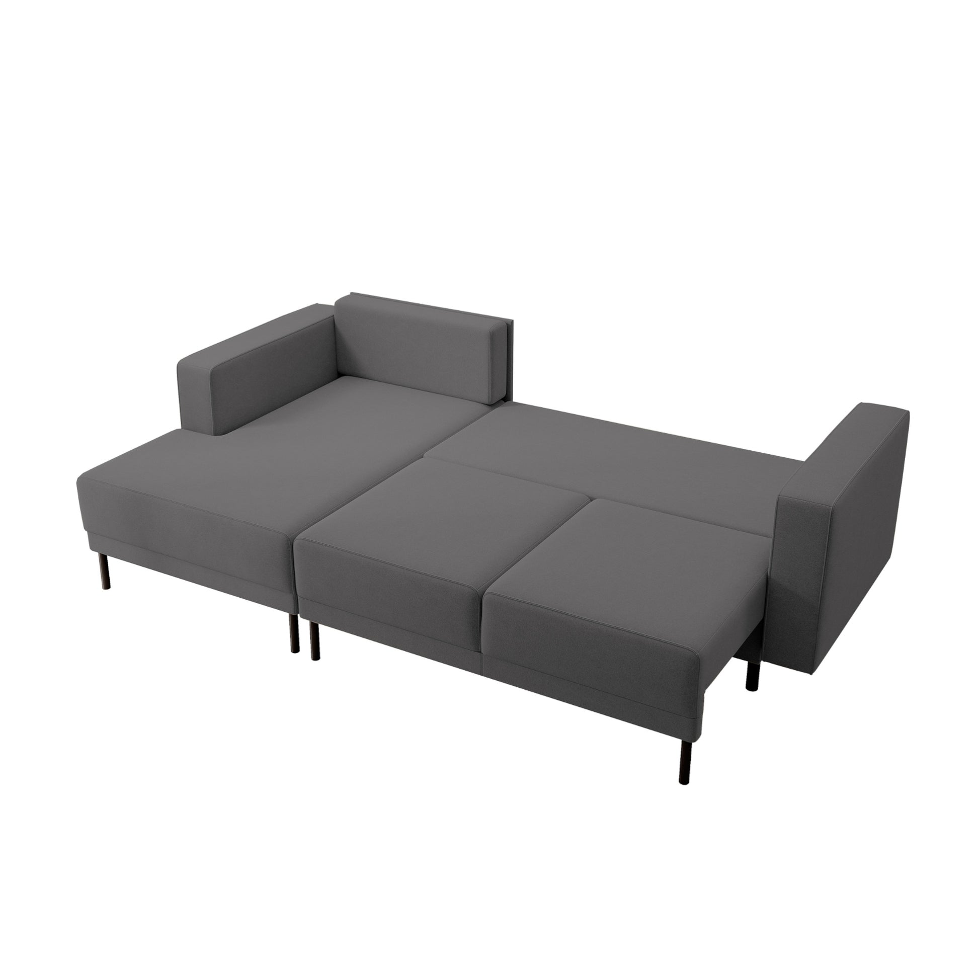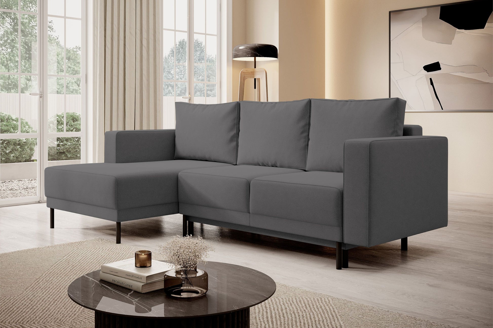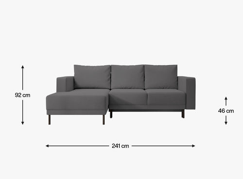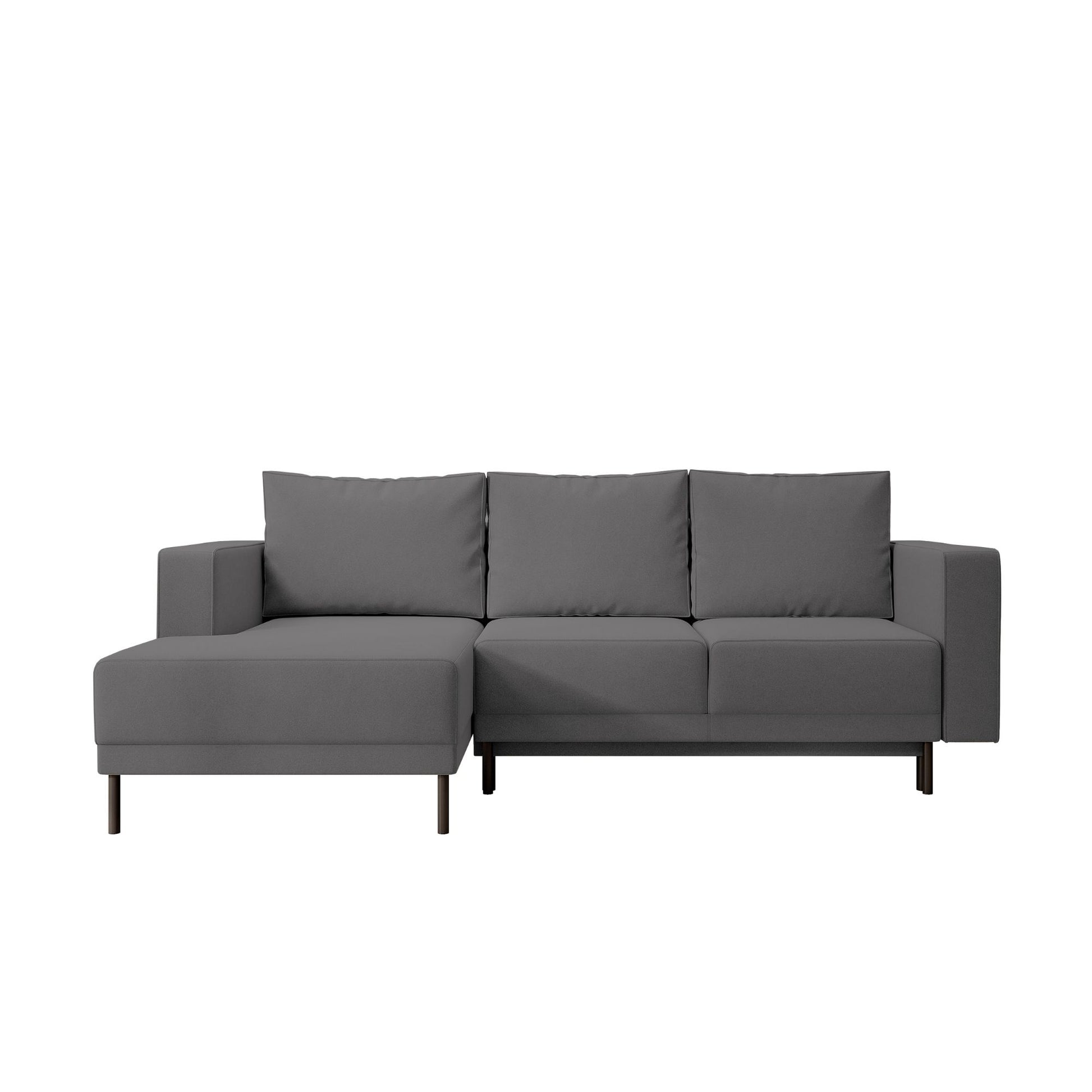 Podniesiony na wysokich, smukłych nogach, mebel zyskuje lekkość wizualną, nie tracąc przy tym nic z solidności. Lewo, lub prawostronna orientacja narożnika sprawia, że świetnie wpasuje się w różnorodne układy pomieszczeń, podkreślając ich nowoczesny charakter.