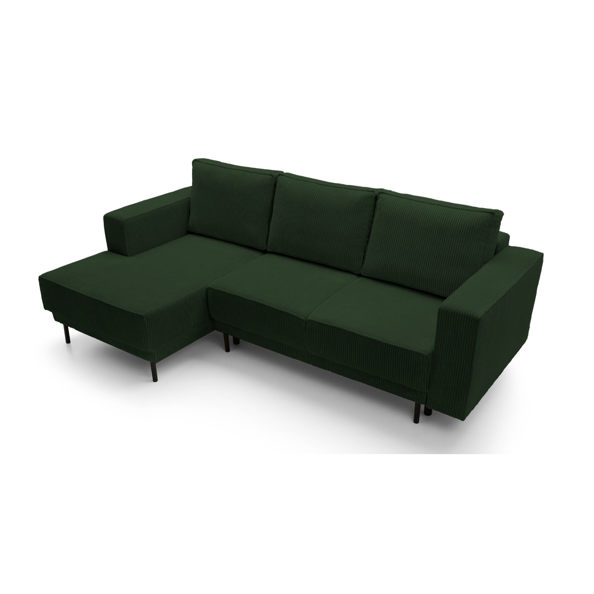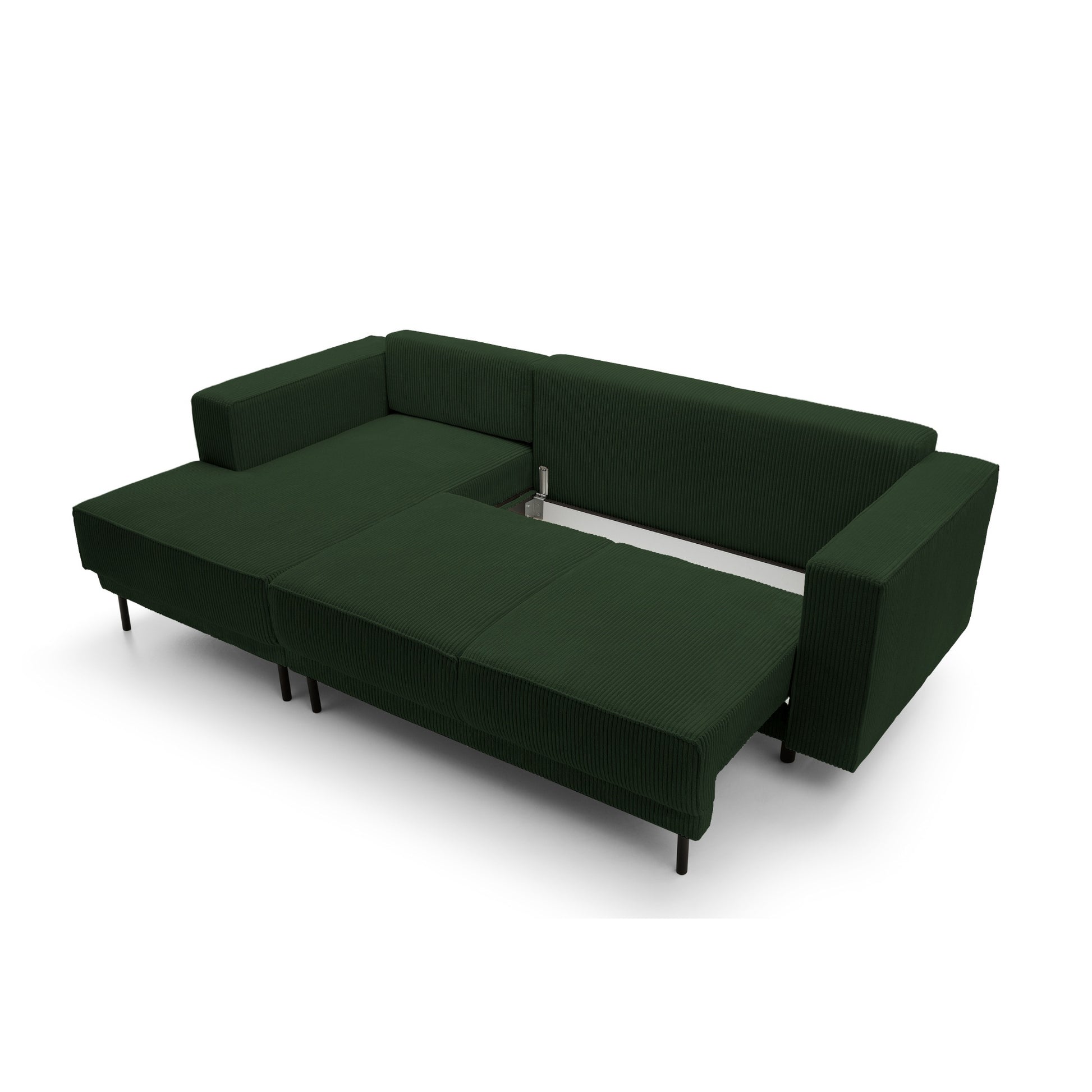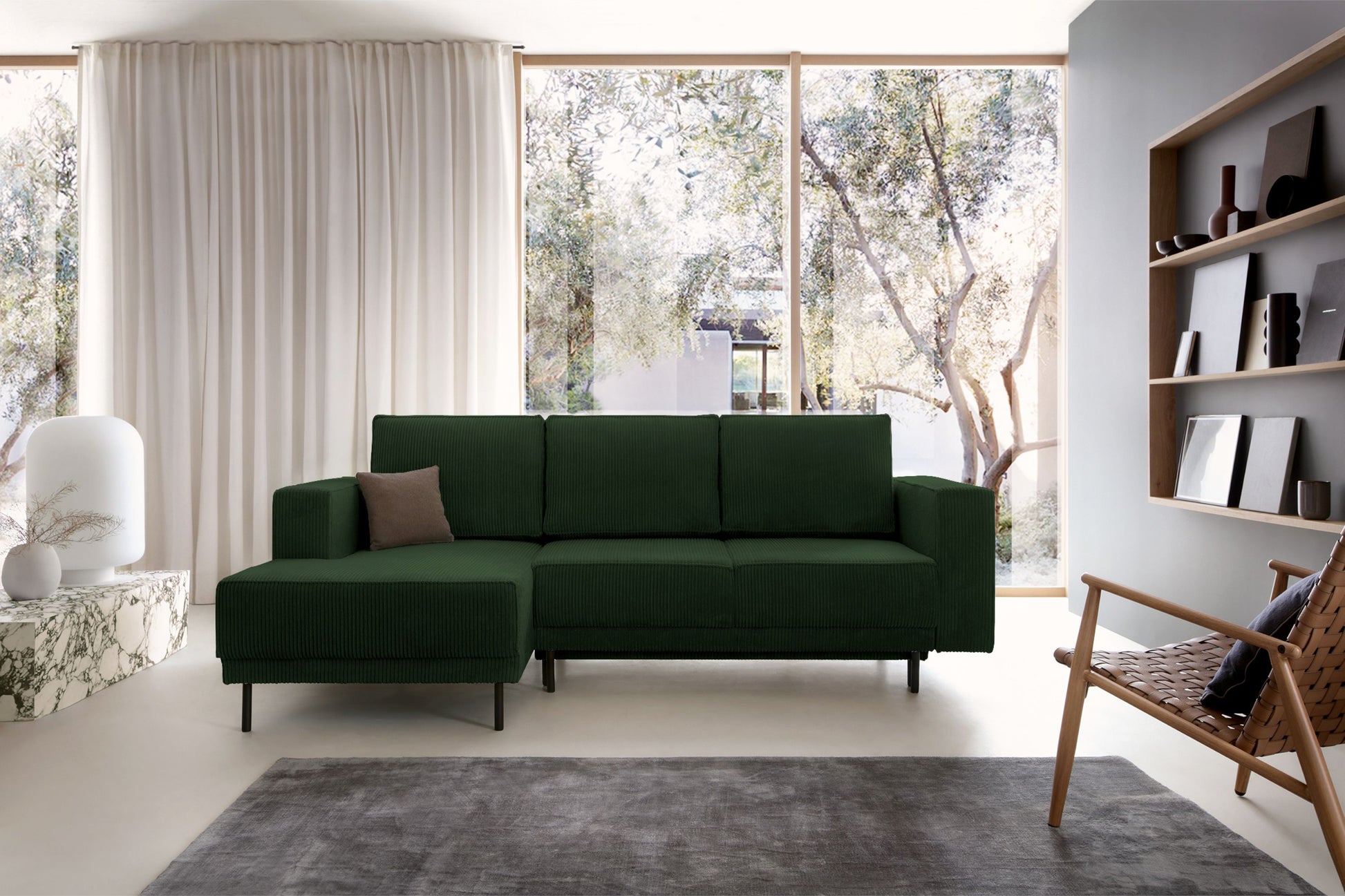 Podniesiony na wysokich, smukłych nogach, mebel zyskuje lekkość wizualną, nie tracąc przy tym nic z solidności. Lewo, lub prawostronna orientacja narożnika sprawia, że świetnie wpasuje się w różnorodne układy pomieszczeń, podkreślając ich nowoczesny charakter.
