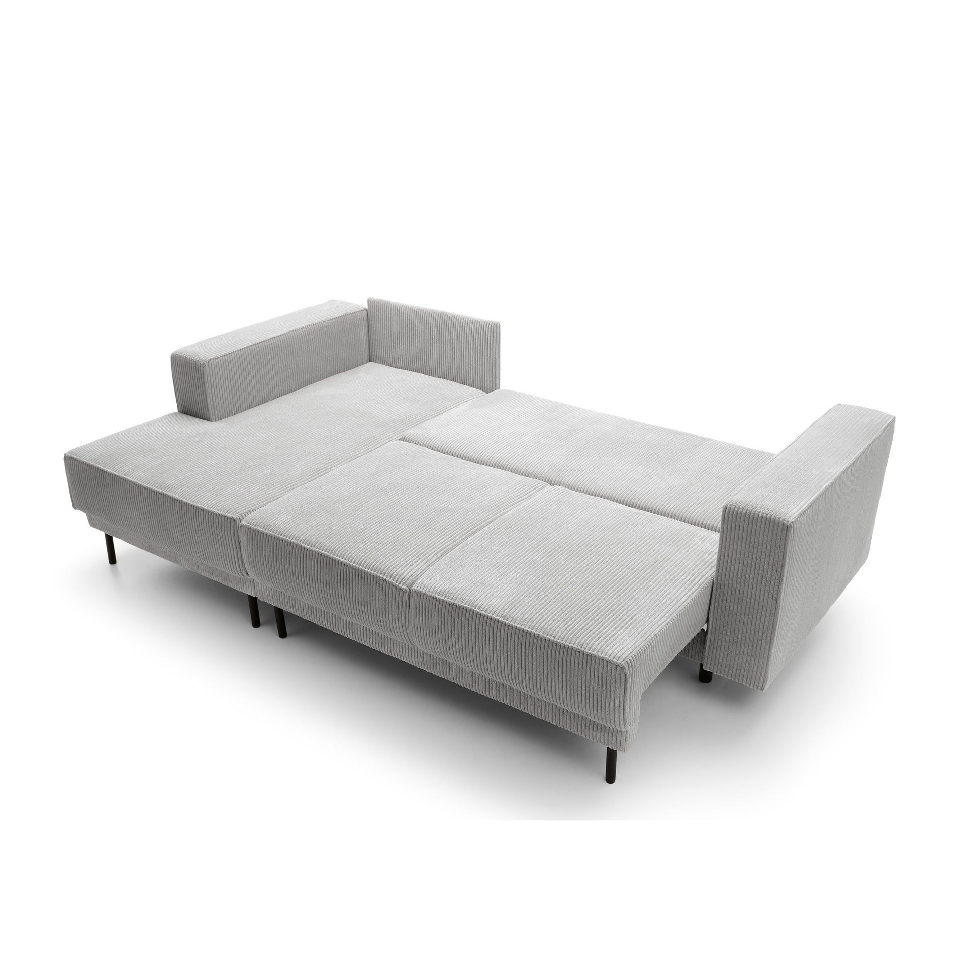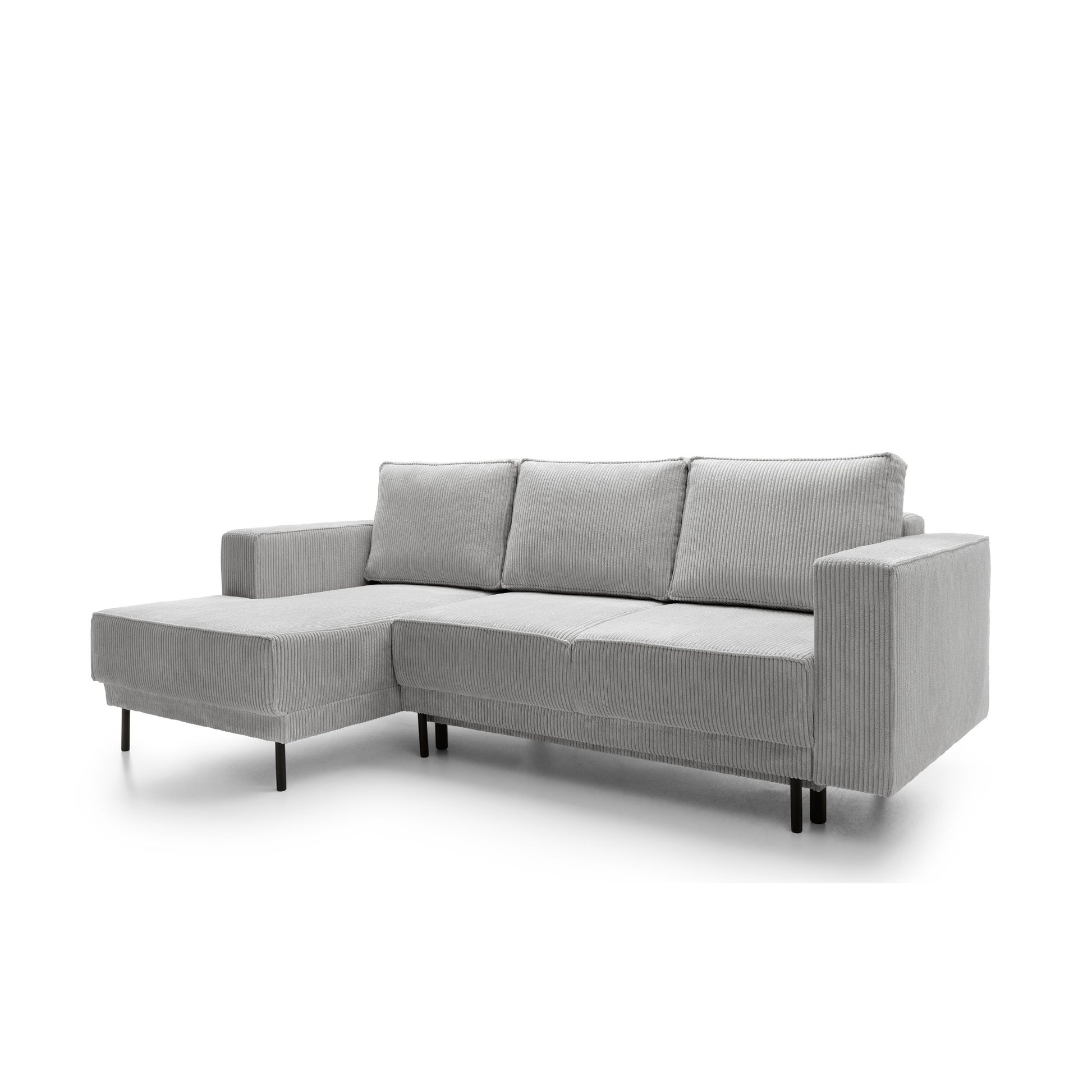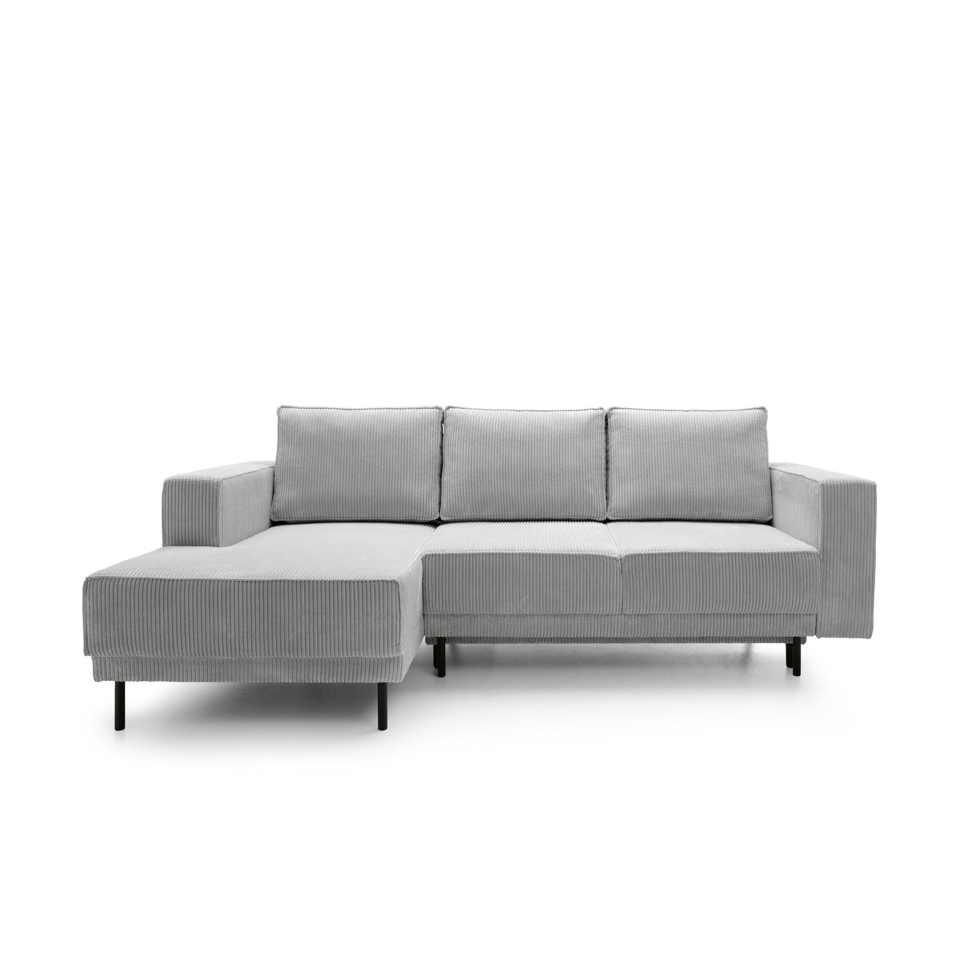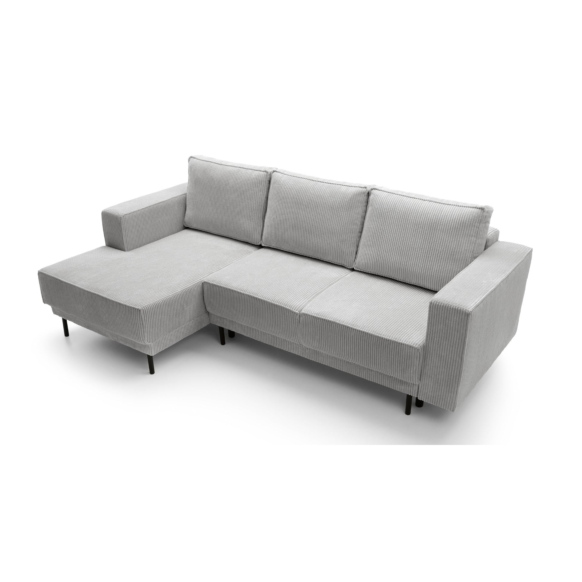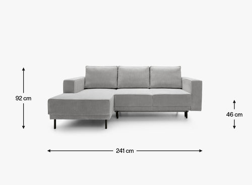Podniesiony na wysokich, smukłych nogach, mebel zyskuje lekkość wizualną, nie tracąc przy tym nic z solidności. Lewo, lub prawostronna orientacja narożnika sprawia, że świetnie wpasuje się w różnorodne układy pomieszczeń, podkreślając ich nowoczesny charakter.