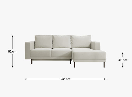 Podniesiony na wysokich, smukłych nogach, mebel zyskuje lekkość wizualną, nie tracąc przy tym nic z solidności. Lewo, lub prawostronna orientacja narożnika sprawia, że świetnie wpasuje się w różnorodne układy pomieszczeń, podkreślając ich nowoczesny charakter.