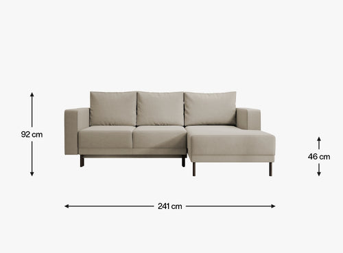 Podniesiony na wysokich, smukłych nogach, mebel zyskuje lekkość wizualną, nie tracąc przy tym nic z solidności. Lewo, lub prawostronna orientacja narożnika sprawia, że świetnie wpasuje się w różnorodne układy pomieszczeń, podkreślając ich nowoczesny charakter.