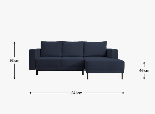 Podniesiony na wysokich, smukłych nogach, mebel zyskuje lekkość wizualną, nie tracąc przy tym nic z solidności. Lewo, lub prawostronna orientacja narożnika sprawia, że świetnie wpasuje się w różnorodne układy pomieszczeń, podkreślając ich nowoczesny charakter.