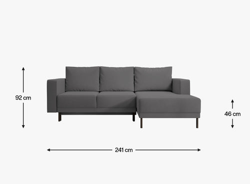 Podniesiony na wysokich, smukłych nogach, mebel zyskuje lekkość wizualną, nie tracąc przy tym nic z solidności. Lewo, lub prawostronna orientacja narożnika sprawia, że świetnie wpasuje się w różnorodne układy pomieszczeń, podkreślając ich nowoczesny charakter.
