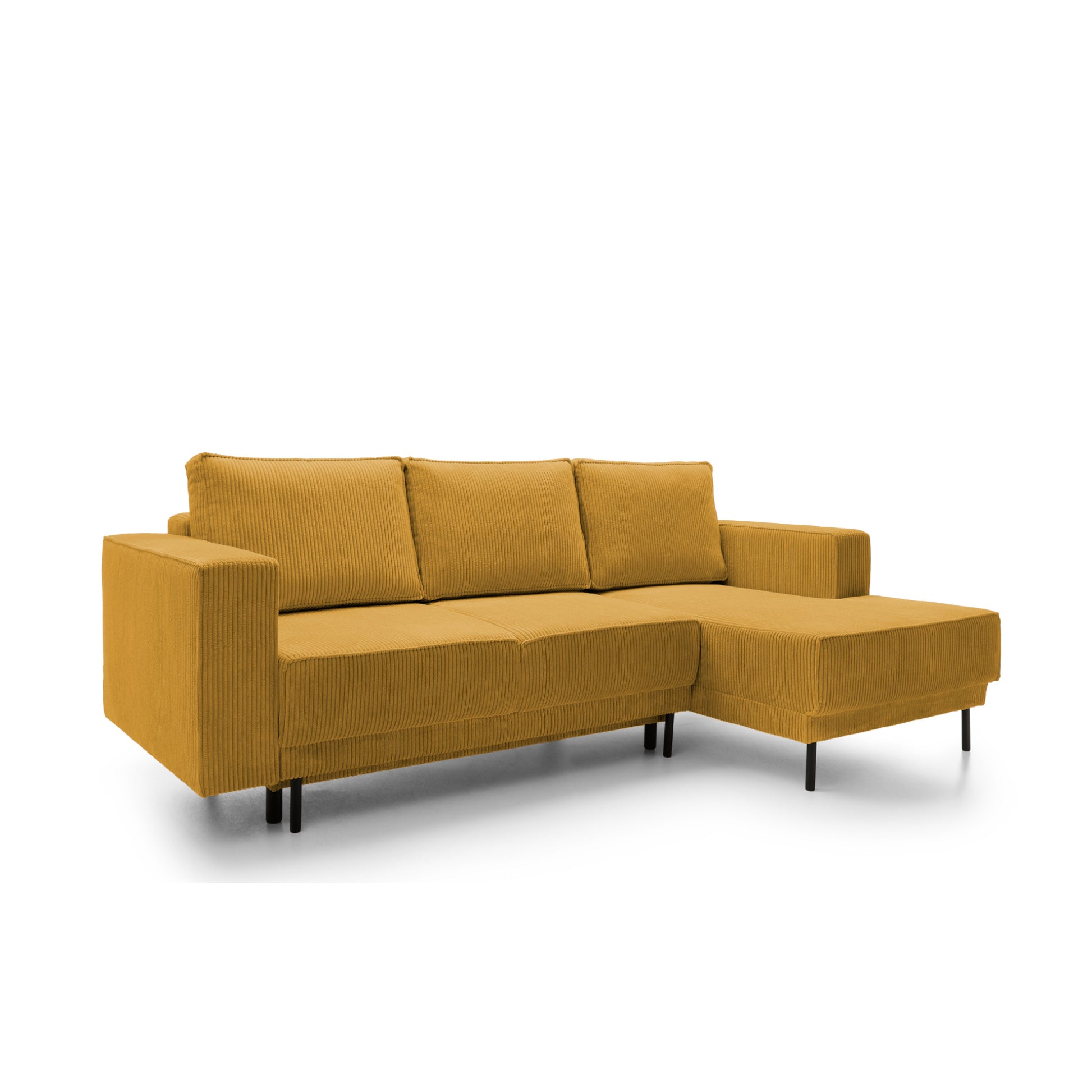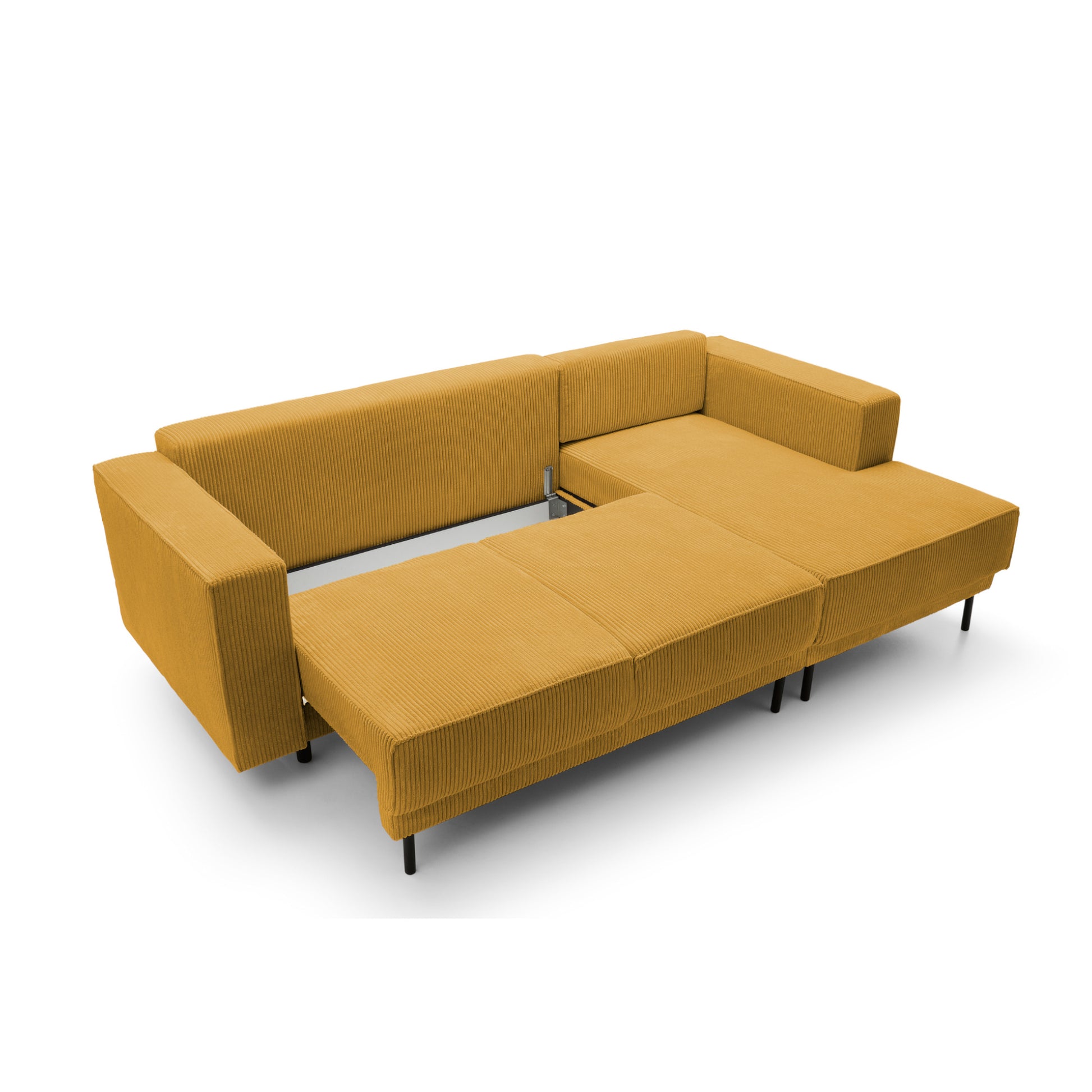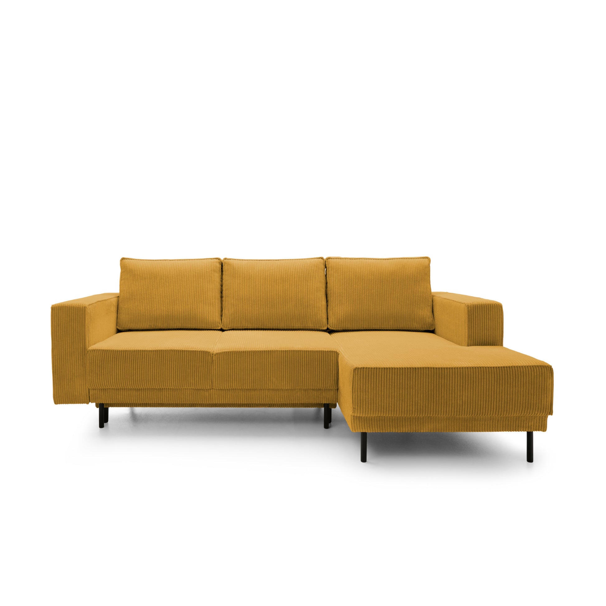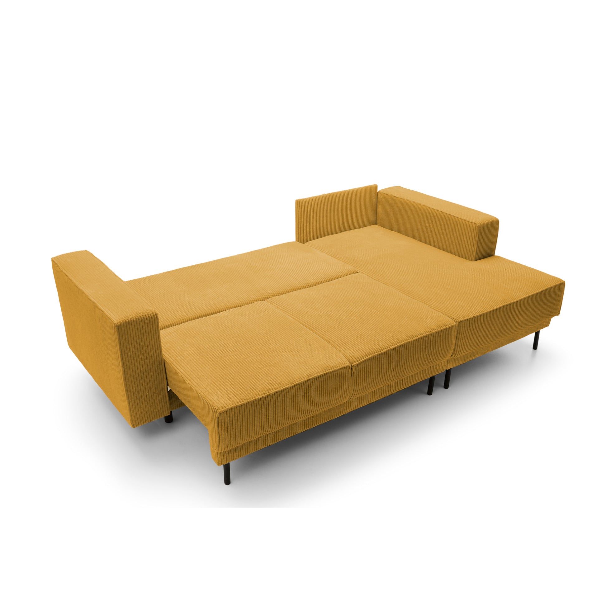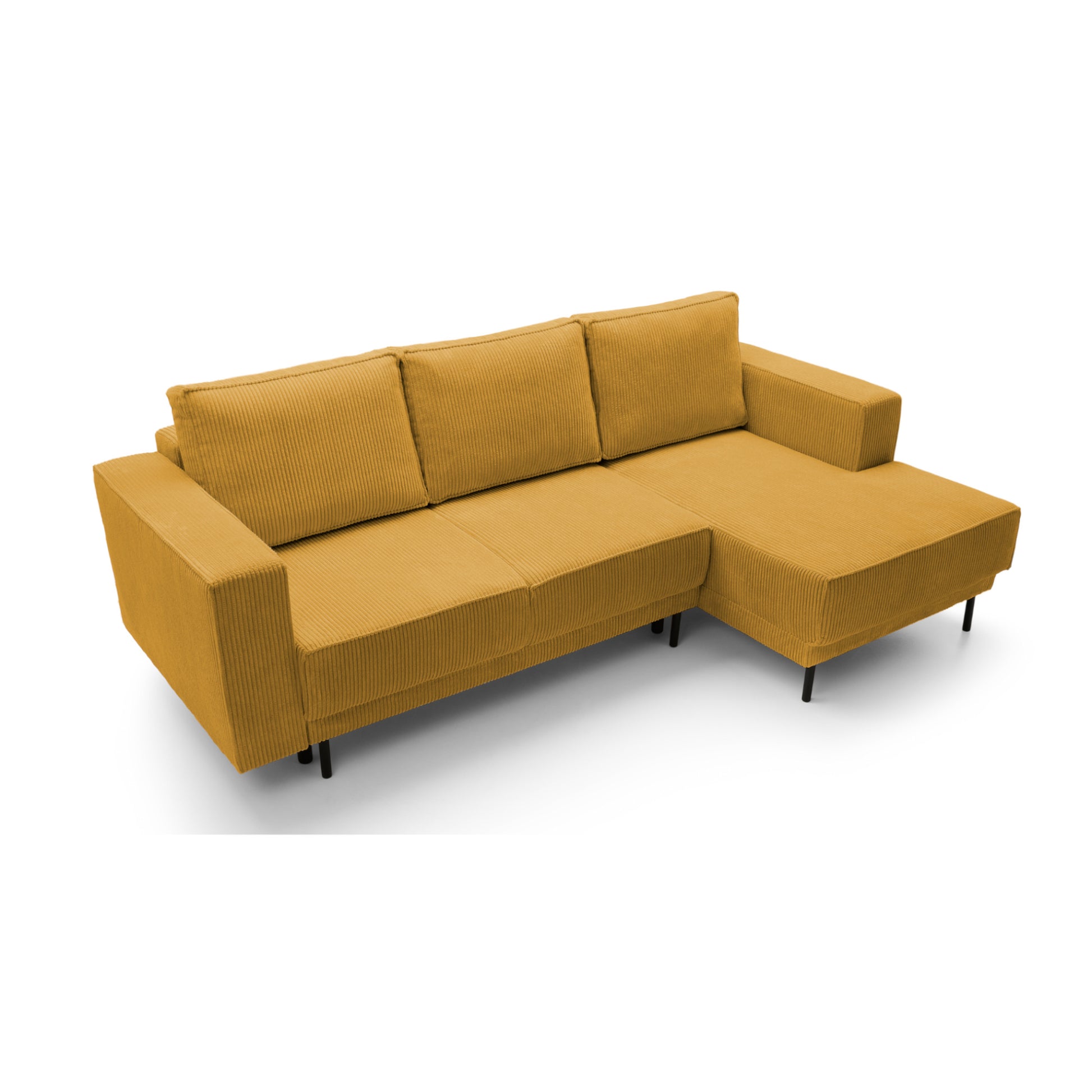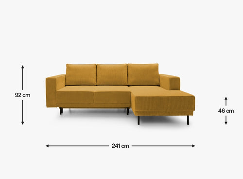 Podniesiony na wysokich, smukłych nogach, mebel zyskuje lekkość wizualną, nie tracąc przy tym nic z solidności. Lewo, lub prawostronna orientacja narożnika sprawia, że świetnie wpasuje się w różnorodne układy pomieszczeń, podkreślając ich nowoczesny charakter.
