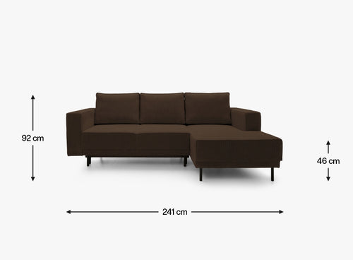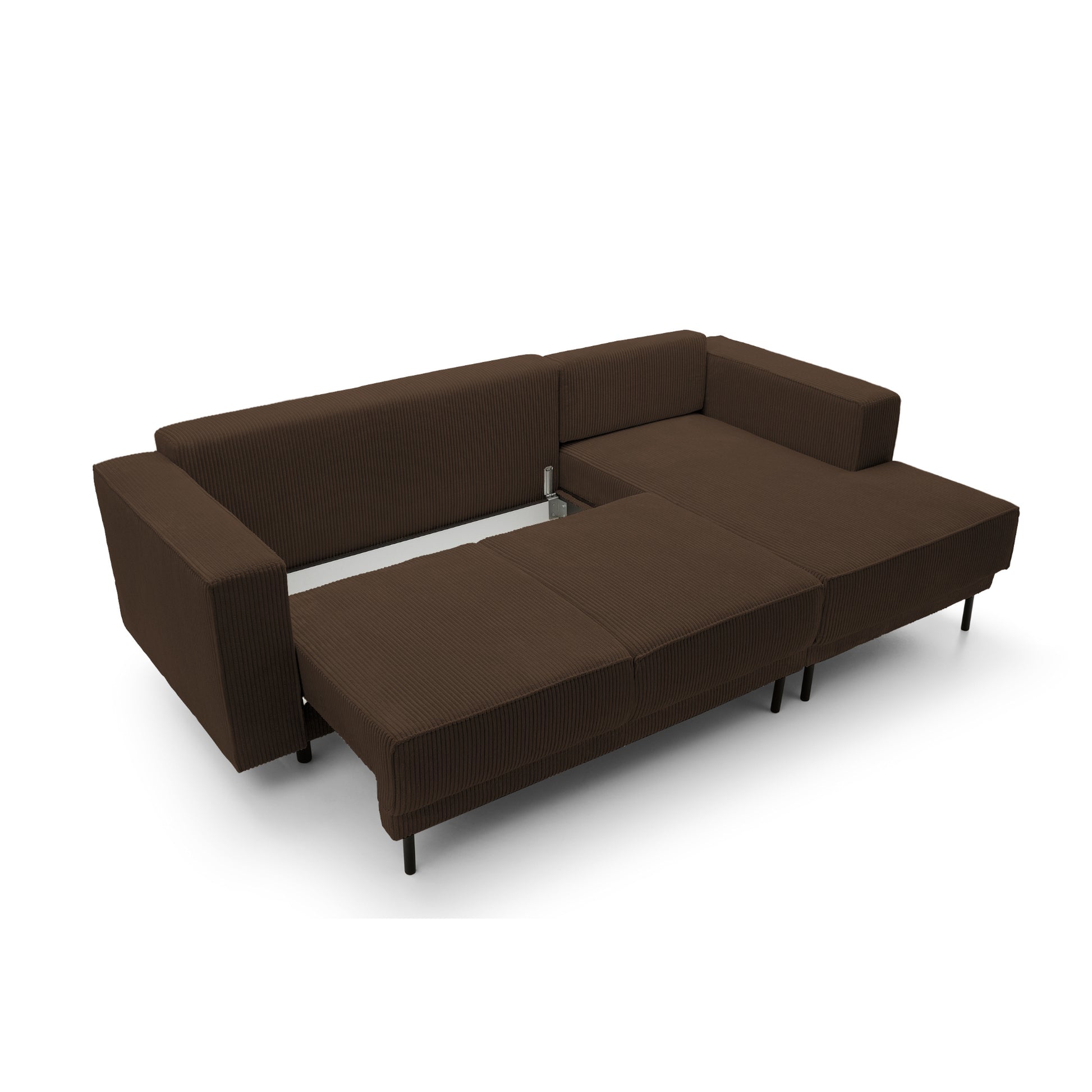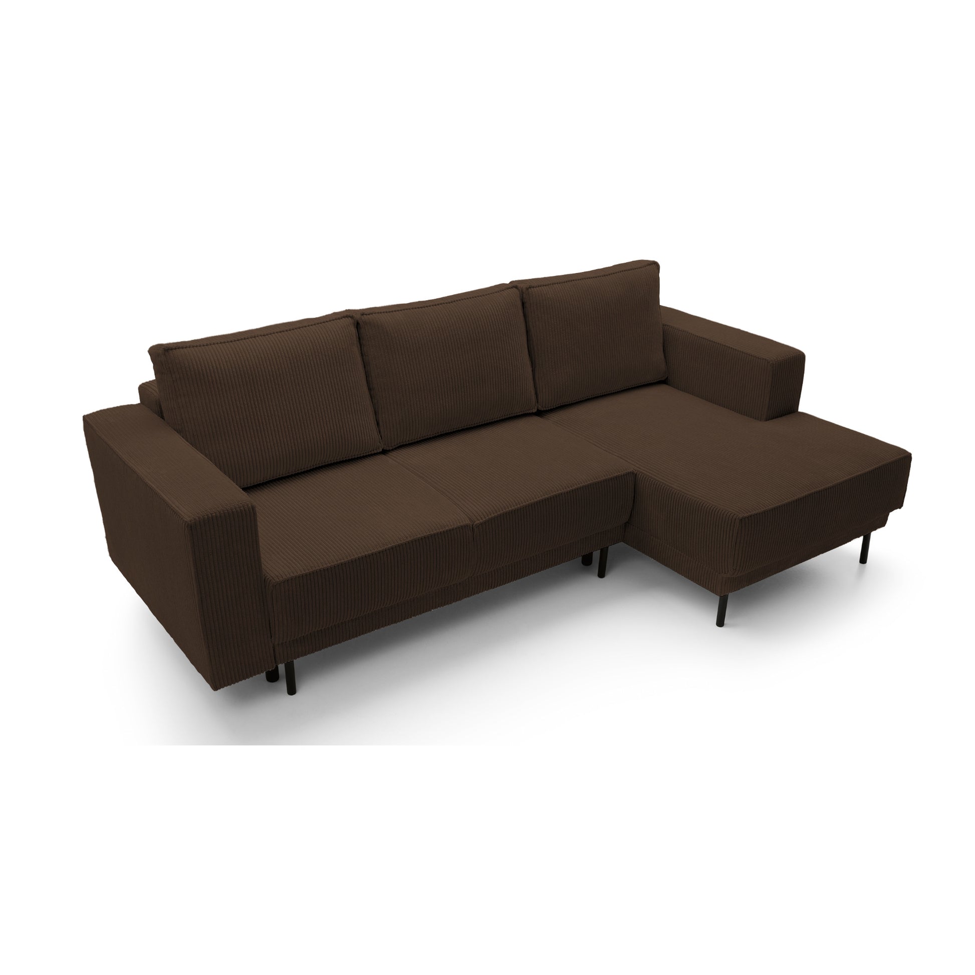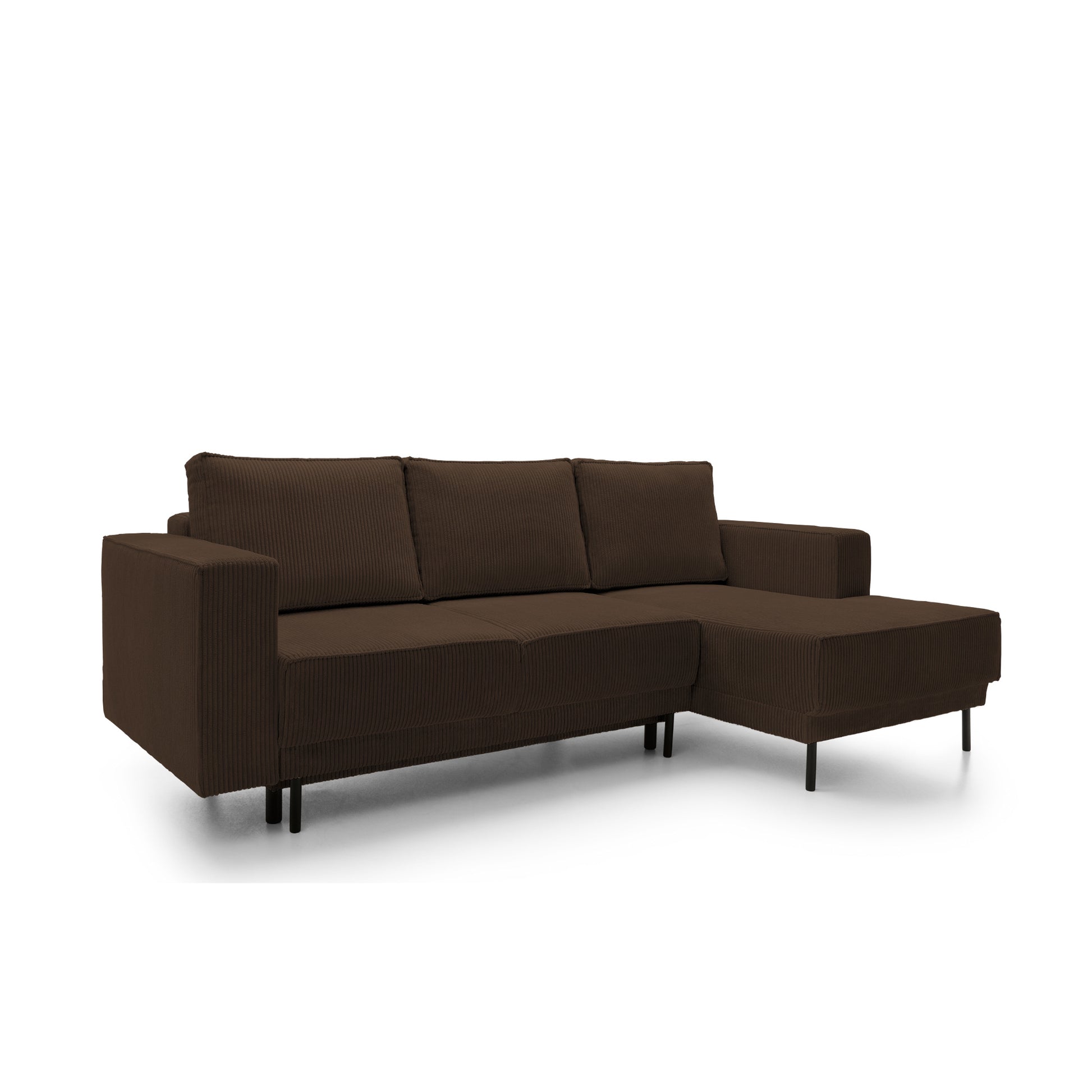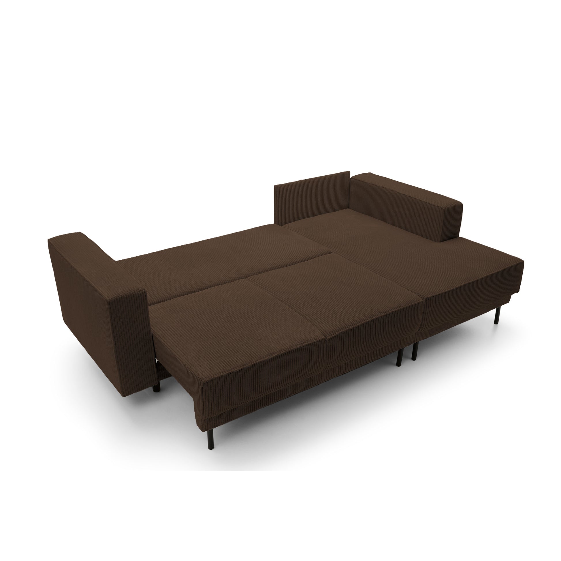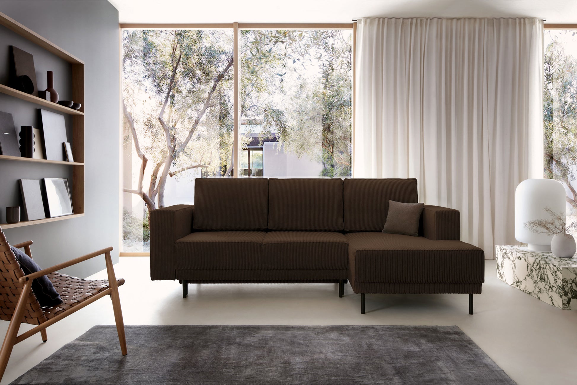 Podniesiony na wysokich, smukłych nogach, mebel zyskuje lekkość wizualną, nie tracąc przy tym nic z solidności. Lewo, lub prawostronna orientacja narożnika sprawia, że świetnie wpasuje się w różnorodne układy pomieszczeń, podkreślając ich nowoczesny charakter.