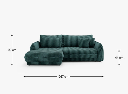 Jego proporcje – szerokość 267 cm, wysokość 90 cm i głębokość 120 cm – czynią go meblem, który doskonale wypełni zarówno przestronny salon, jak i mniejsze wnętrze. Dzięki modułowi narożnemu o głębokości 181 cm można bez trudu wyciągnąć nogi i oddać się błogiemu relaksowi. Nogi o wysokości 3 cm zapewniają stabilność, a podłokietniki na wysokości 68 cm gwarantują komfortowe podparcie.