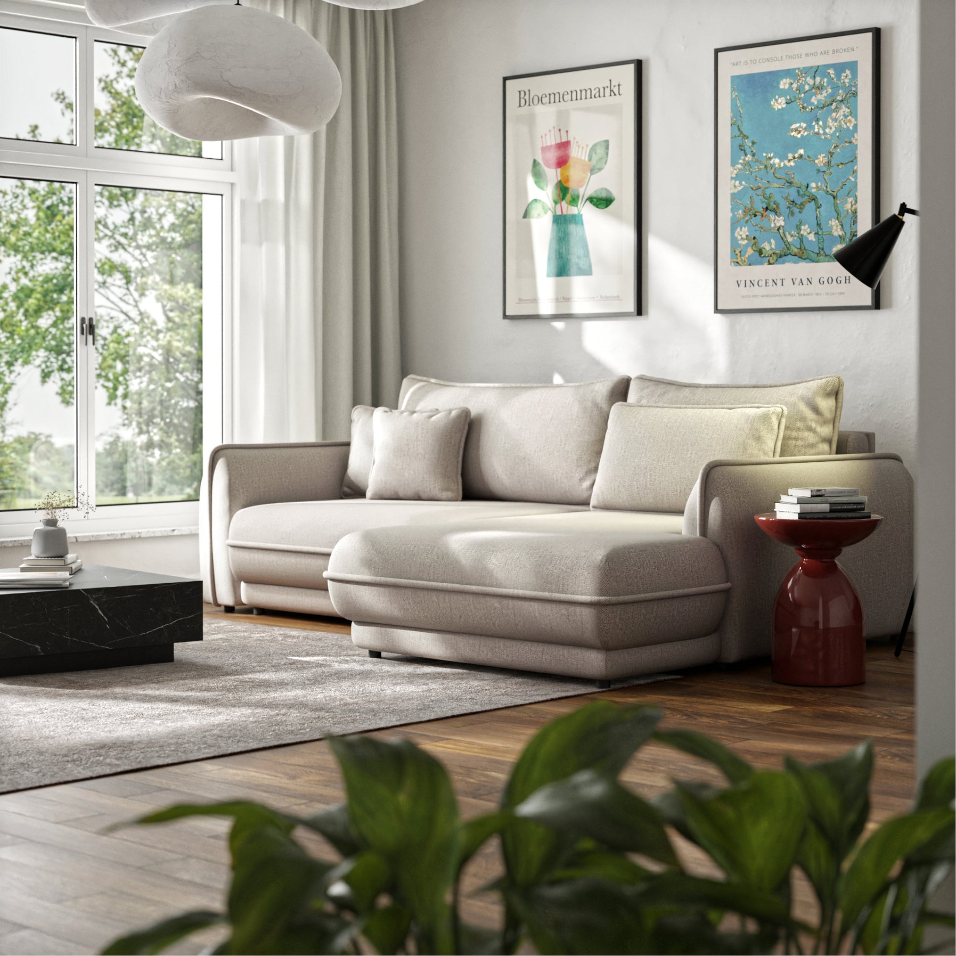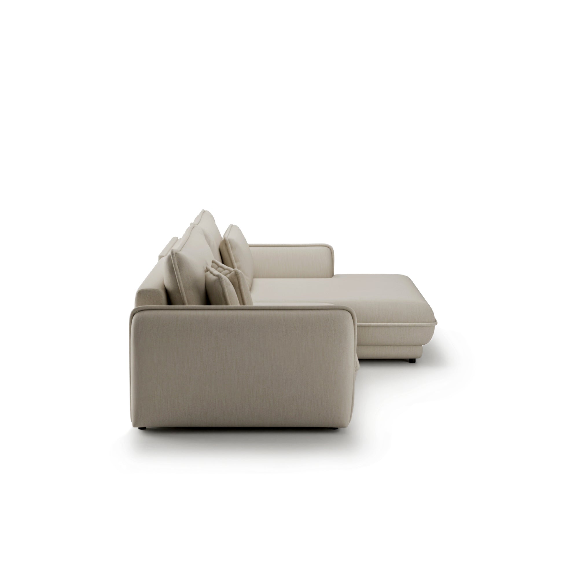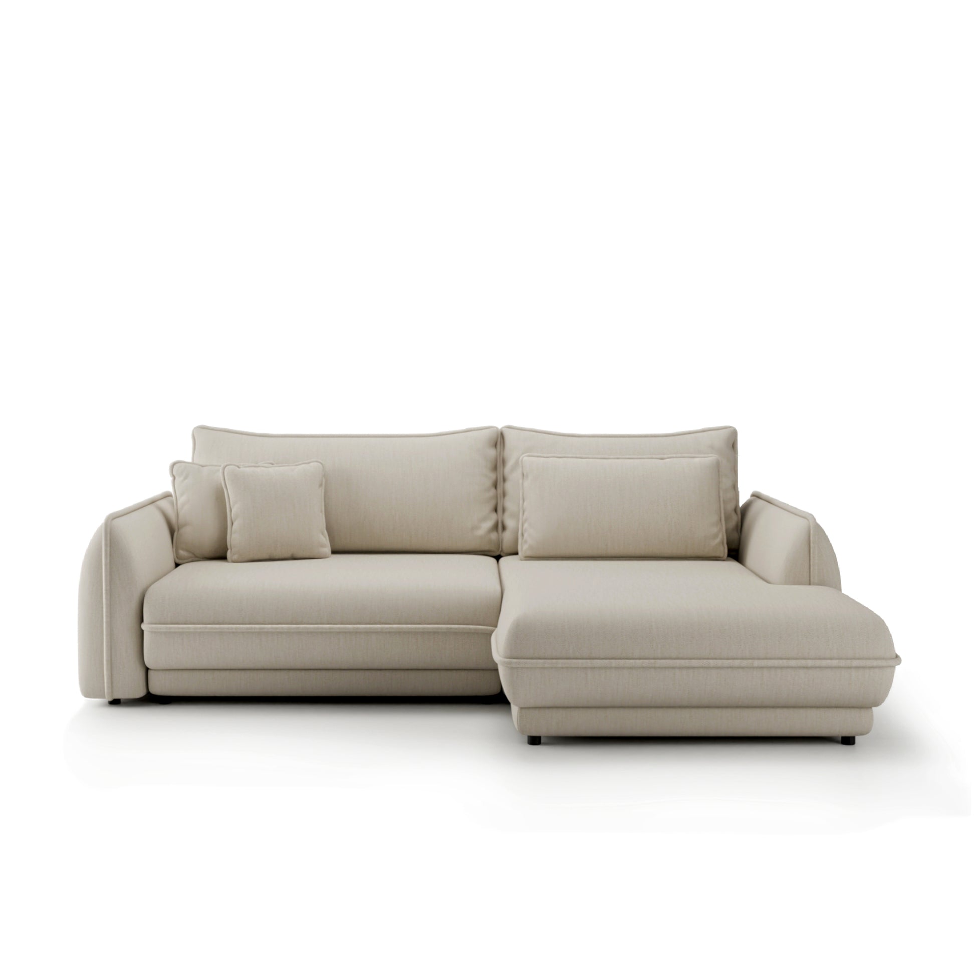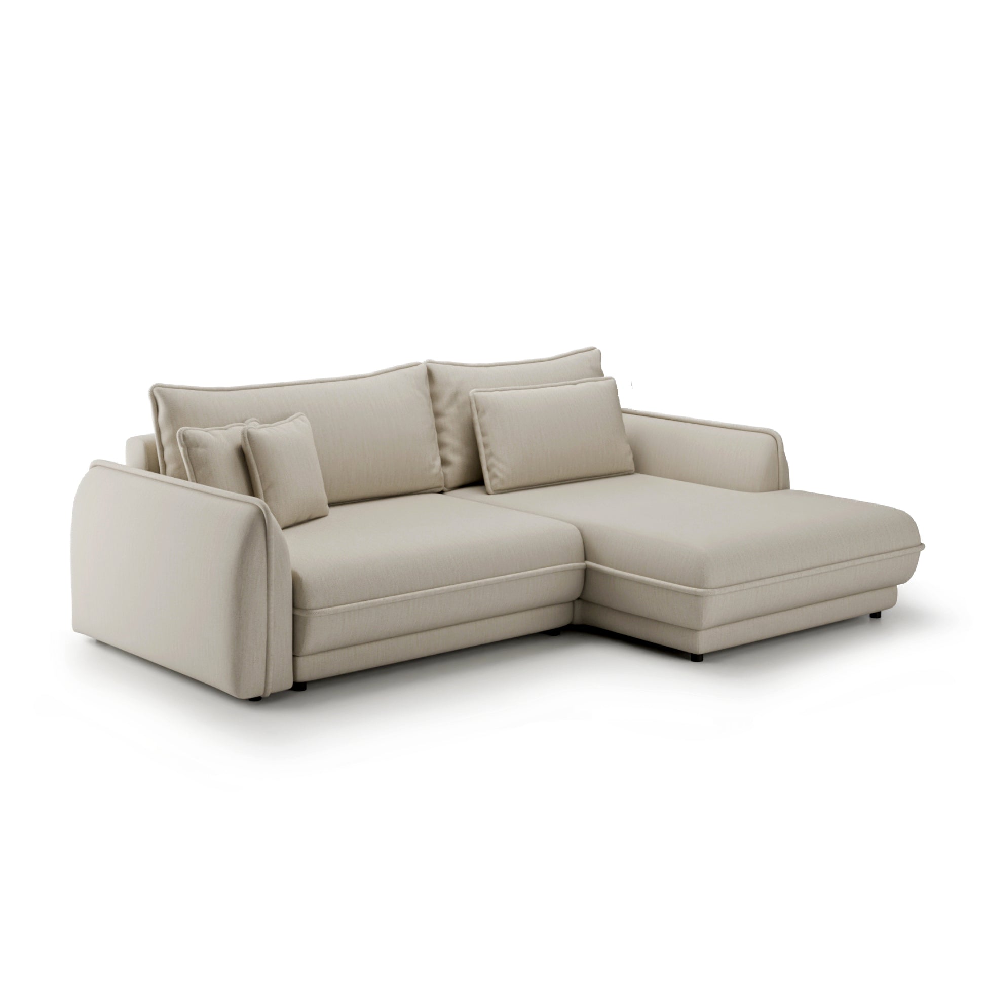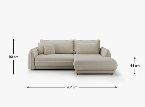Dzięki intuicyjnemu mechanizmowi rozkładania, w zaledwie kilka chwil narożnik przekształca się w wygodne łóżko o powierzchni 214 × 160 cm, idealne zarówno na codzienny, jak i okazjonalny nocny wypoczynek. Praktyczny pojemnik na pościel pozwala z łatwością przechować koce czy poduszki, pomagając utrzymać porządek w salonie.