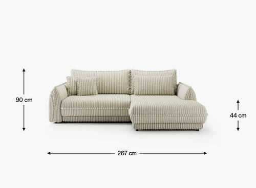 Jego proporcje – szerokość 267 cm, wysokość 90 cm i głębokość 120 cm – czynią go meblem, który doskonale wypełni zarówno przestronny salon, jak i mniejsze wnętrze. Dzięki modułowi narożnemu o głębokości 181 cm można bez trudu wyciągnąć nogi i oddać się błogiemu relaksowi. Nogi o wysokości 3 cm zapewniają stabilność, a podłokietniki na wysokości 68 cm gwarantują komfortowe podparcie.