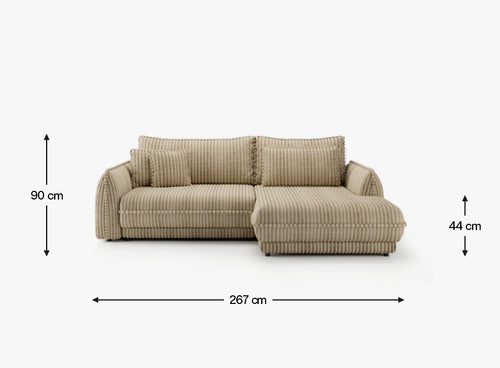 Jego proporcje – szerokość 267 cm, wysokość 90 cm i głębokość 120 cm – czynią go meblem, który doskonale wypełni zarówno przestronny salon, jak i mniejsze wnętrze. Dzięki modułowi narożnemu o głębokości 181 cm można bez trudu wyciągnąć nogi i oddać się błogiemu relaksowi. Nogi o wysokości 3 cm zapewniają stabilność, a podłokietniki na wysokości 68 cm gwarantują komfortowe podparcie.