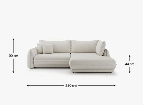 Z wymiarami 280 × 120 × 190 cm, Mojave II oferuje przestronną strefę relaksu, która doskonale sprawdzi się w codziennym użytkowaniu – od leniwych popołudni po rodzinne wieczory. Miękkie, szerokie siedzisko (72 cm głębokości użytkowej) i dwie dodatkowe poduszki oparciowe zapewniają odpowiednie podparcie dla kręgosłupa oraz wysoki komfort wypoczynku. Siedzisko o wysokości 44 cm oraz podłokietniki 68 cm tworzą ergonomiczne warunki do odpoczynku w pozycji siedzącej i leżącej.