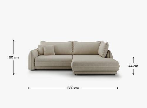 Z wymiarami 280 × 120 × 190 cm, Mojave II oferuje przestronną strefę relaksu, która doskonale sprawdzi się w codziennym użytkowaniu – od leniwych popołudni po rodzinne wieczory. Miękkie, szerokie siedzisko (72 cm głębokości użytkowej) i dwie dodatkowe poduszki oparciowe zapewniają odpowiednie podparcie dla kręgosłupa oraz wysoki komfort wypoczynku. Siedzisko o wysokości 44 cm oraz podłokietniki 68 cm tworzą ergonomiczne warunki do odpoczynku w pozycji siedzącej i leżącej.