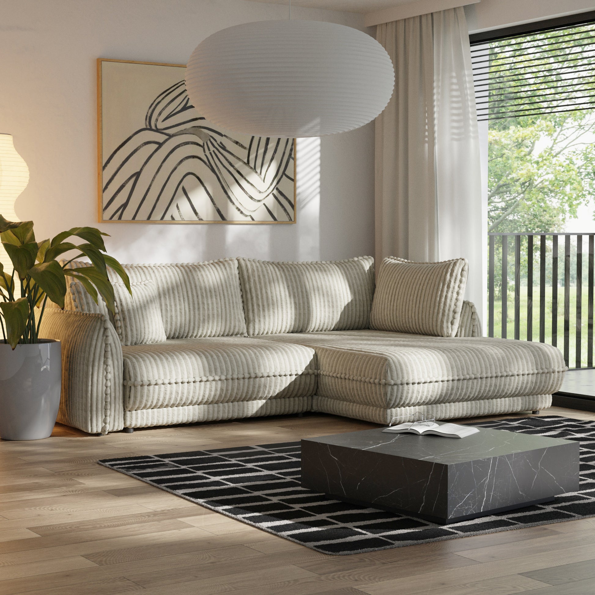 Narożnik wspiera się na niskich, 3-centymetrowych nogach, co dodaje mu stabilności, zachowując przy tym lekkość formy. Mojave II to mebel, który łączy styl z funkcjonalnością, stanowiąc komfortowe i eleganckie serce nowoczesnego salonu.