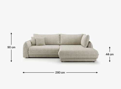 Z wymiarami 280 × 120 × 190 cm, Mojave II oferuje przestronną strefę relaksu, która doskonale sprawdzi się w codziennym użytkowaniu – od leniwych popołudni po rodzinne wieczory. Miękkie, szerokie siedzisko (72 cm głębokości użytkowej) i dwie dodatkowe poduszki oparciowe zapewniają odpowiednie podparcie dla kręgosłupa oraz wysoki komfort wypoczynku. Siedzisko o wysokości 44 cm oraz podłokietniki 68 cm tworzą ergonomiczne warunki do odpoczynku w pozycji siedzącej i leżącej.