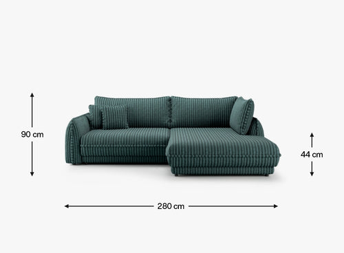 Z wymiarami 280 × 120 × 190 cm, Mojave II oferuje przestronną strefę relaksu, która doskonale sprawdzi się w codziennym użytkowaniu – od leniwych popołudni po rodzinne wieczory. Miękkie, szerokie siedzisko (72 cm głębokości użytkowej) i dwie dodatkowe poduszki oparciowe zapewniają odpowiednie podparcie dla kręgosłupa oraz wysoki komfort wypoczynku. Siedzisko o wysokości 44 cm oraz podłokietniki 68 cm tworzą ergonomiczne warunki do odpoczynku w pozycji siedzącej i leżącej.