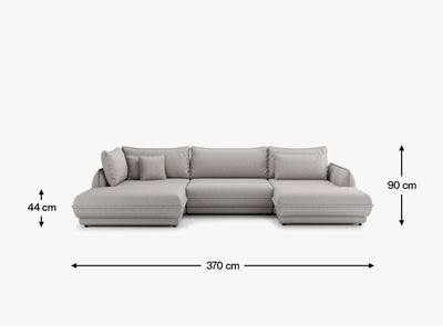 Całość wspiera się na stabilnych nogach o wysokości 3 cm, a podłokietniki na poziomie 68 cm oferują dodatkowe podparcie. Wysokość całkowita narożnika to 90 cm, a szerokość aż 370 cm, co sprawia, że Mojave III imponuje swoją przestronnością i świetnie prezentuje się w większych wnętrzach.