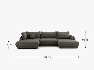 Całość wspiera się na stabilnych nogach o wysokości 3 cm, a podłokietniki na poziomie 68 cm oferują dodatkowe podparcie. Wysokość całkowita narożnika to 90 cm, a szerokość aż 370 cm, co sprawia, że Mojave III imponuje swoją przestronnością i świetnie prezentuje się w większych wnętrzach.