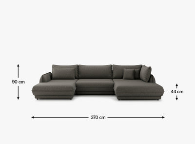 Całość wspiera się na stabilnych nogach o wysokości 3 cm, a podłokietniki na poziomie 68 cm oferują dodatkowe podparcie. Wysokość całkowita narożnika to 90 cm, a szerokość aż 370 cm, co sprawia, że Mojave III imponuje swoją przestronnością i świetnie prezentuje się w większych wnętrzach.