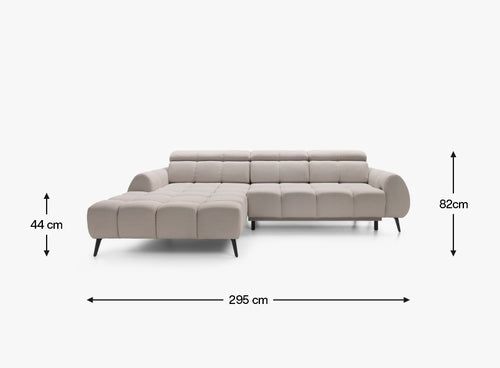 Do produkcji narożnika użyto materiałów zapewniających maksymalny komfort – zarówno podczas rodzinnych spotkań, jak i podczas chwili wytchnienia w pojedynkę. Duża, szeroka otomana i miękkie wypełnienie potęgują uczucie wygody, a elektryczny wysuw siedziska do 25 cm pozwala na stworzenie dodatkowej przestrzeni do relaksu.