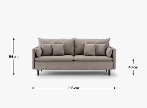 Sofa została wyposażona w łatwy w obsłudze system rozkładania DL, dzięki któremu w kilka chwil zmienia się w pełnowymiarowe łóżko o powierzchni 200 x 140 cm. Pojemny schowek na pościel to ukłon w stronę codziennej funkcjonalności – pozwala z łatwością utrzymać porządek.