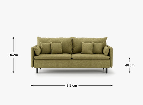 Jej szerokość całkowita to 215 cm, co czyni ją idealnym wyborem do salonów o różnych metrażach. Wysokie na 94 cm oparcie, głębokość 96 cm oraz siedzisko o szerokości 198 cm i wysokości 48 cm zapewniają wygodę zarówno podczas codziennego wypoczynku, jak i dłuższych spotkań z bliskimi. Dzięki głębi 54 cm do poduszek, sofa oferuje miękkie, przyjemne podparcie, a jej wysokie podłokietniki (62 cm) zwiększają komfort użytkowania.