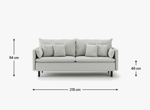 Jej szerokość całkowita to 215 cm, co czyni ją idealnym wyborem do salonów o różnych metrażach. Wysokie na 94 cm oparcie, głębokość 96 cm oraz siedzisko o szerokości 198 cm i wysokości 48 cm zapewniają wygodę zarówno podczas codziennego wypoczynku, jak i dłuższych spotkań z bliskimi. Dzięki głębi 54 cm do poduszek, sofa oferuje miękkie, przyjemne podparcie, a jej wysokie podłokietniki (62 cm) zwiększają komfort użytkowania.