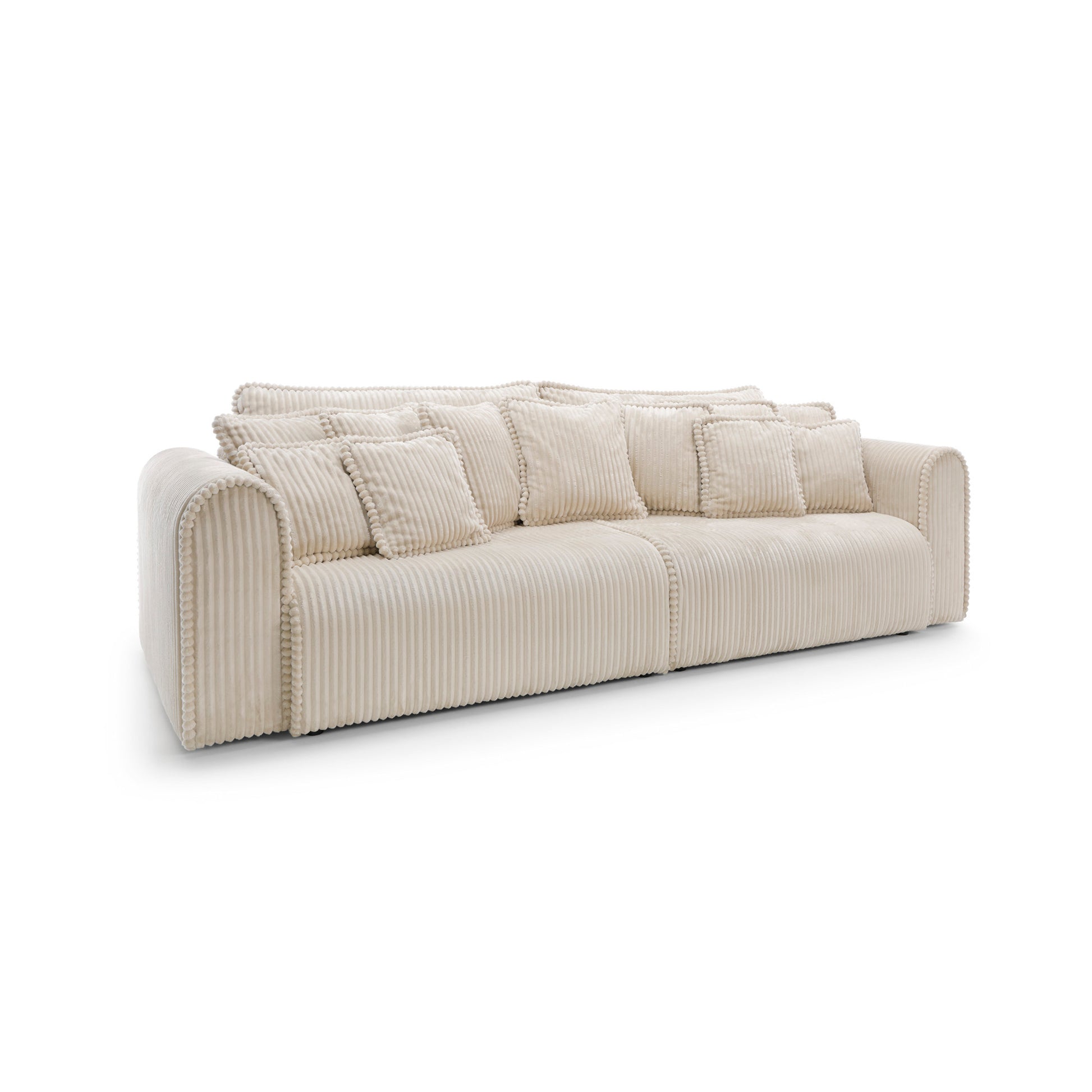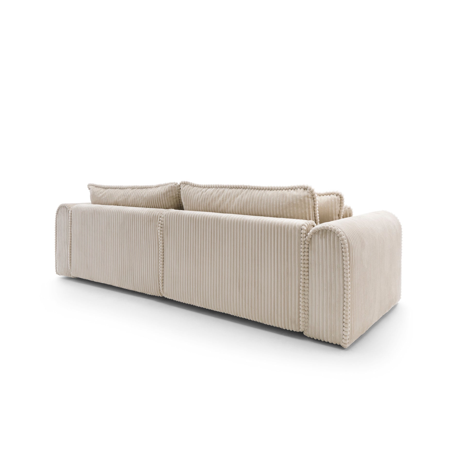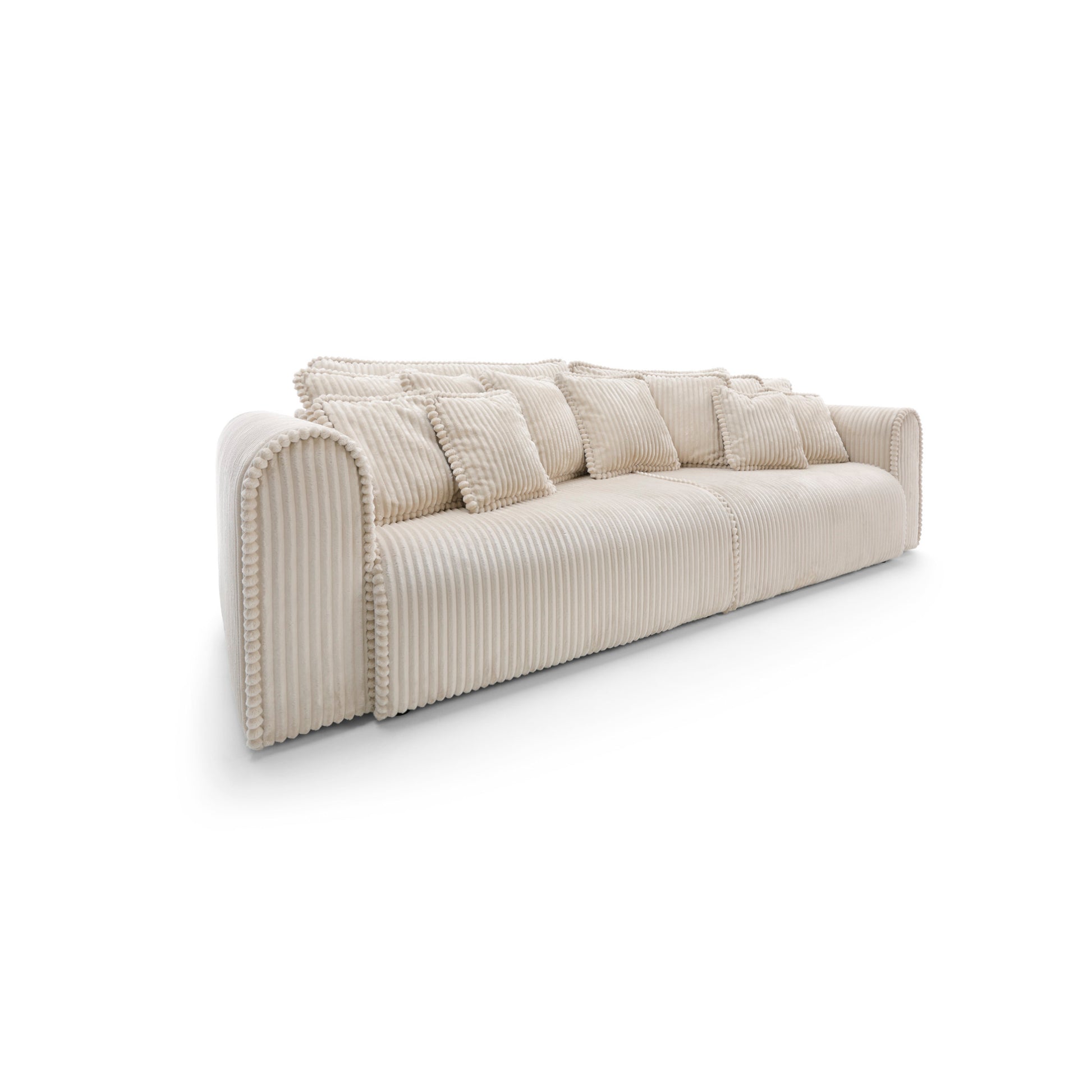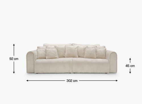 Big Buddy – sofa z funkcją spania i pojemnikiem na pościel to połączenie nowoczesnego designu, maksymalnej funkcjonalności i nieprzeciętnego komfortu. Jej monumentalna forma (302 cm szerokości) od razu przyciąga wzrok, a zaokrąglone kształty i pionowe przeszycia nadają jej stylowego, przytulnego charakteru. Tapicerowana sztruksem Tilia 03 – tkaniną o wysokiej odporności na ścieranie (90 000–100 000 cykli Martindale’a) i przyjazną zwierzętom – świetnie sprawdza się w codziennym użytkowaniu.