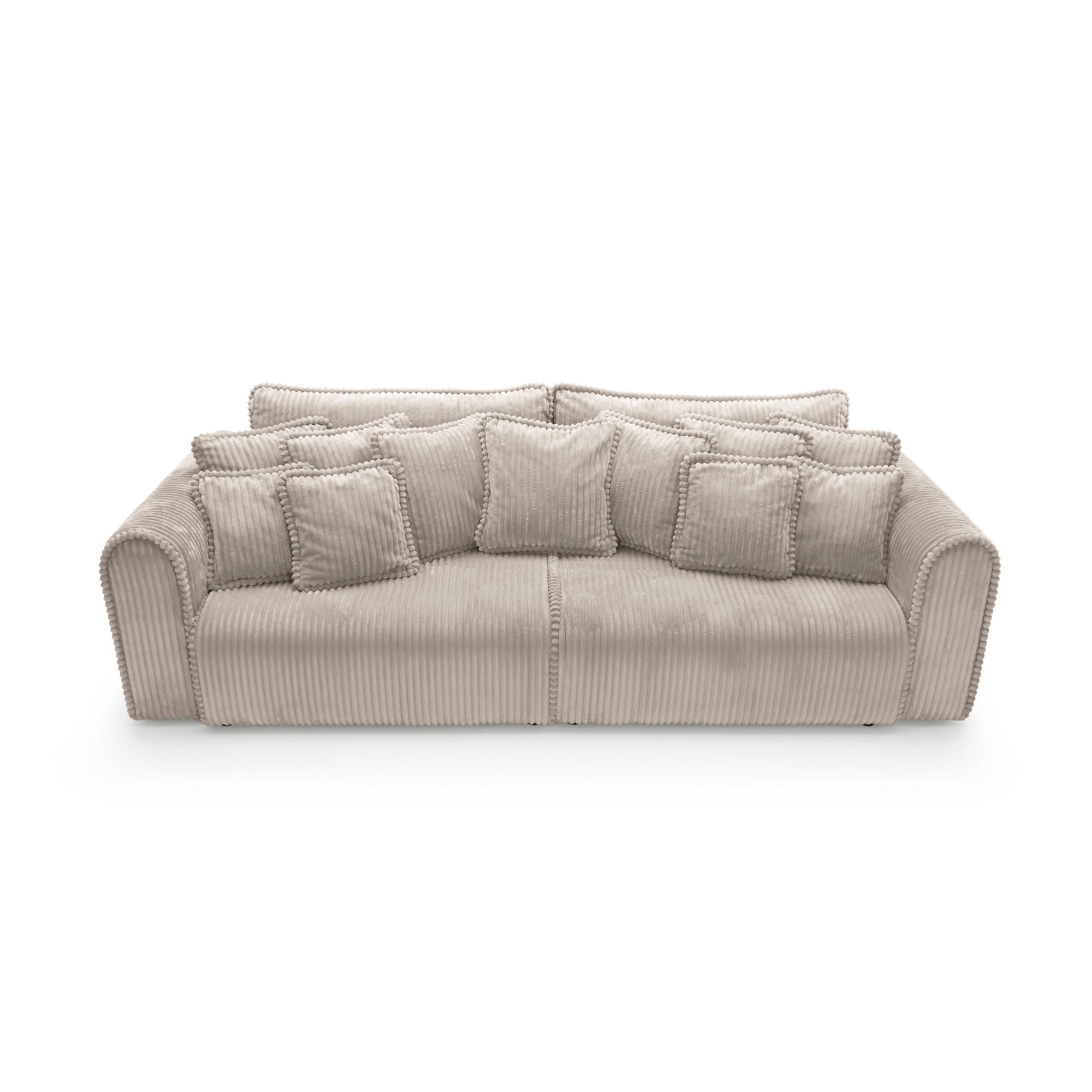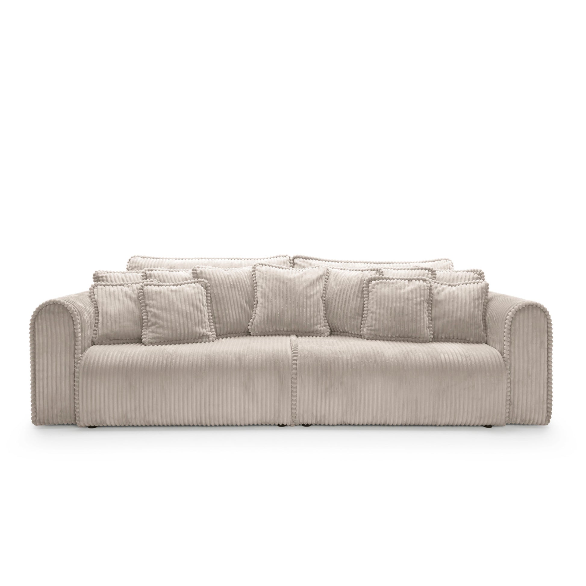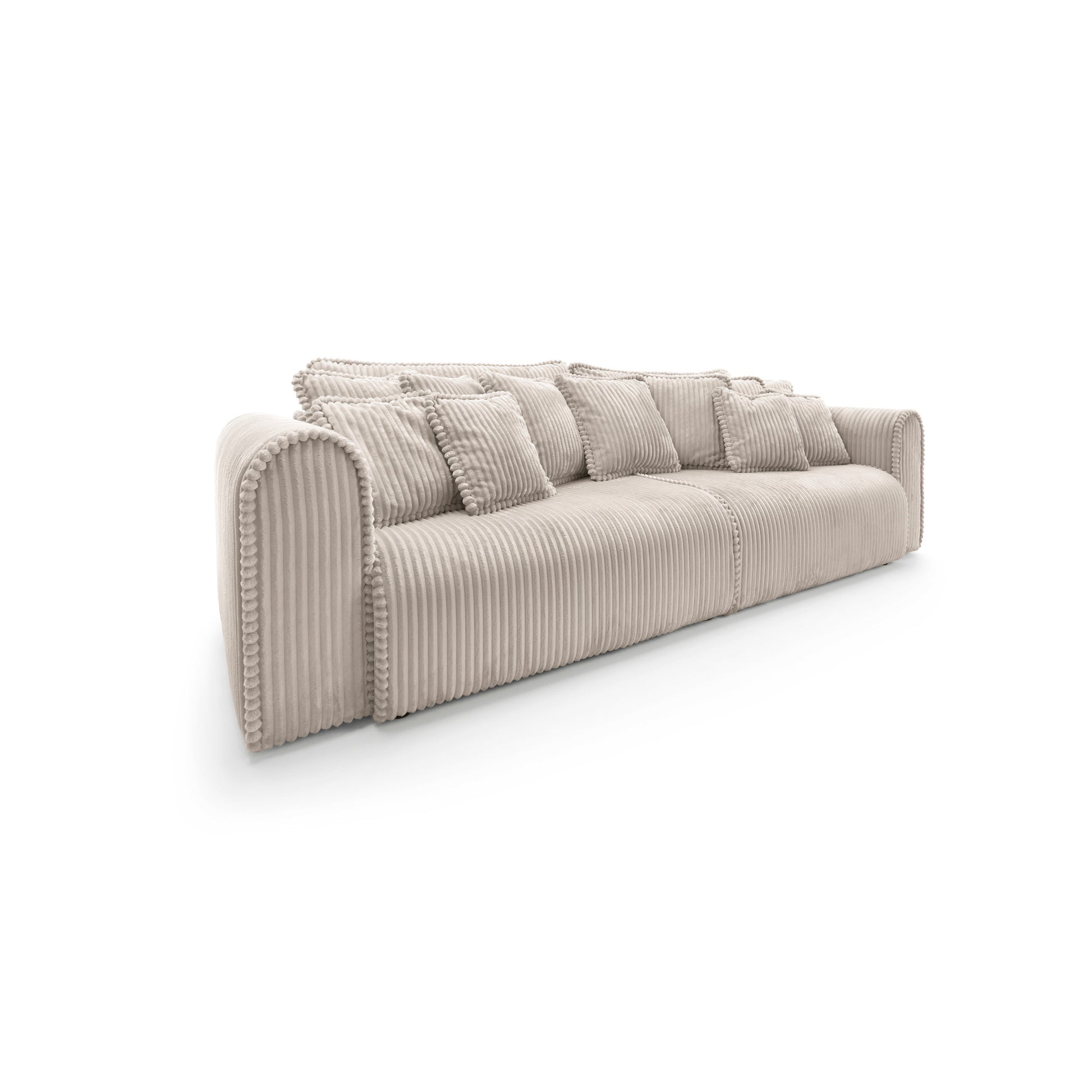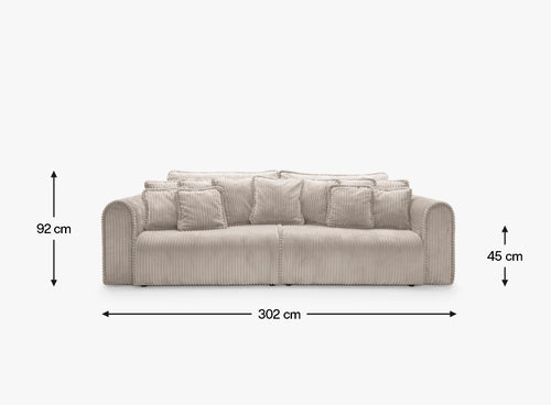 Big Buddy – sofa z funkcją spania i pojemnikiem na pościel to połączenie nowoczesnego designu, maksymalnej funkcjonalności i nieprzeciętnego komfortu. Jej monumentalna forma (302 cm szerokości) od razu przyciąga wzrok, a zaokrąglone kształty i pionowe przeszycia nadają jej stylowego, przytulnego charakteru. Tapicerowana sztruksem Tilia 11 – tkaniną o wysokiej odporności na ścieranie (90 000–100 000 cykli Martindale’a) i przyjazną zwierzętom – świetnie sprawdza się w codziennym użytkowaniu.