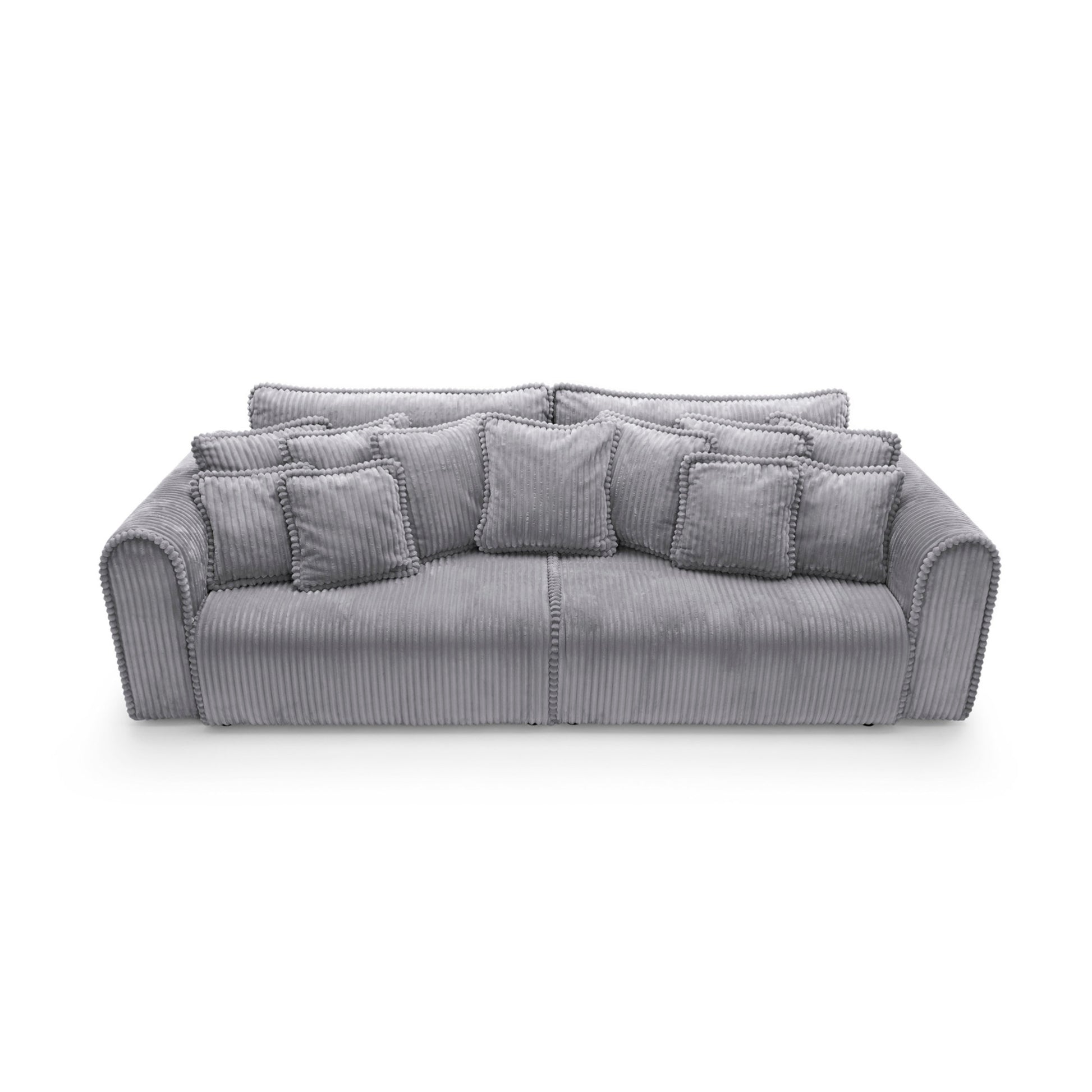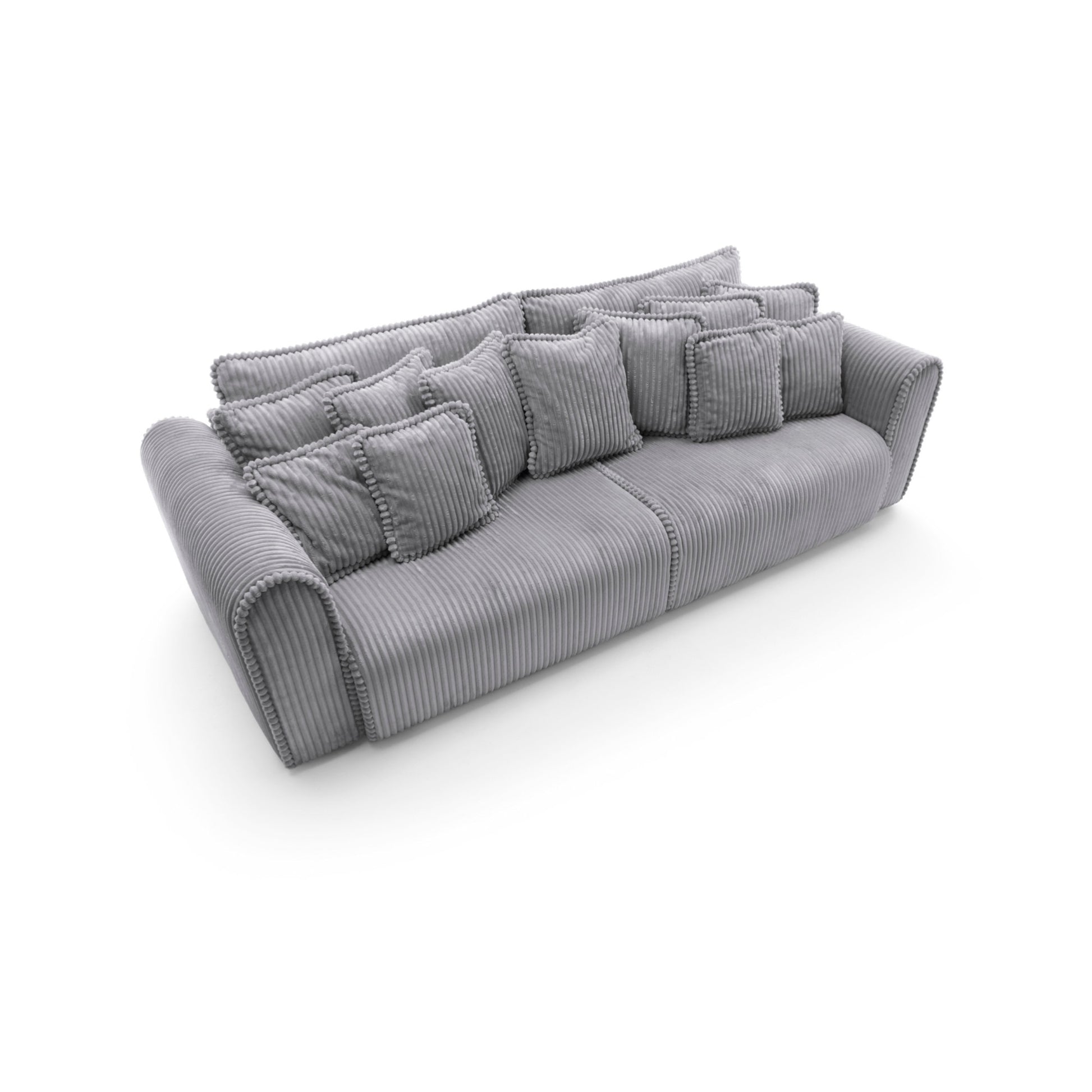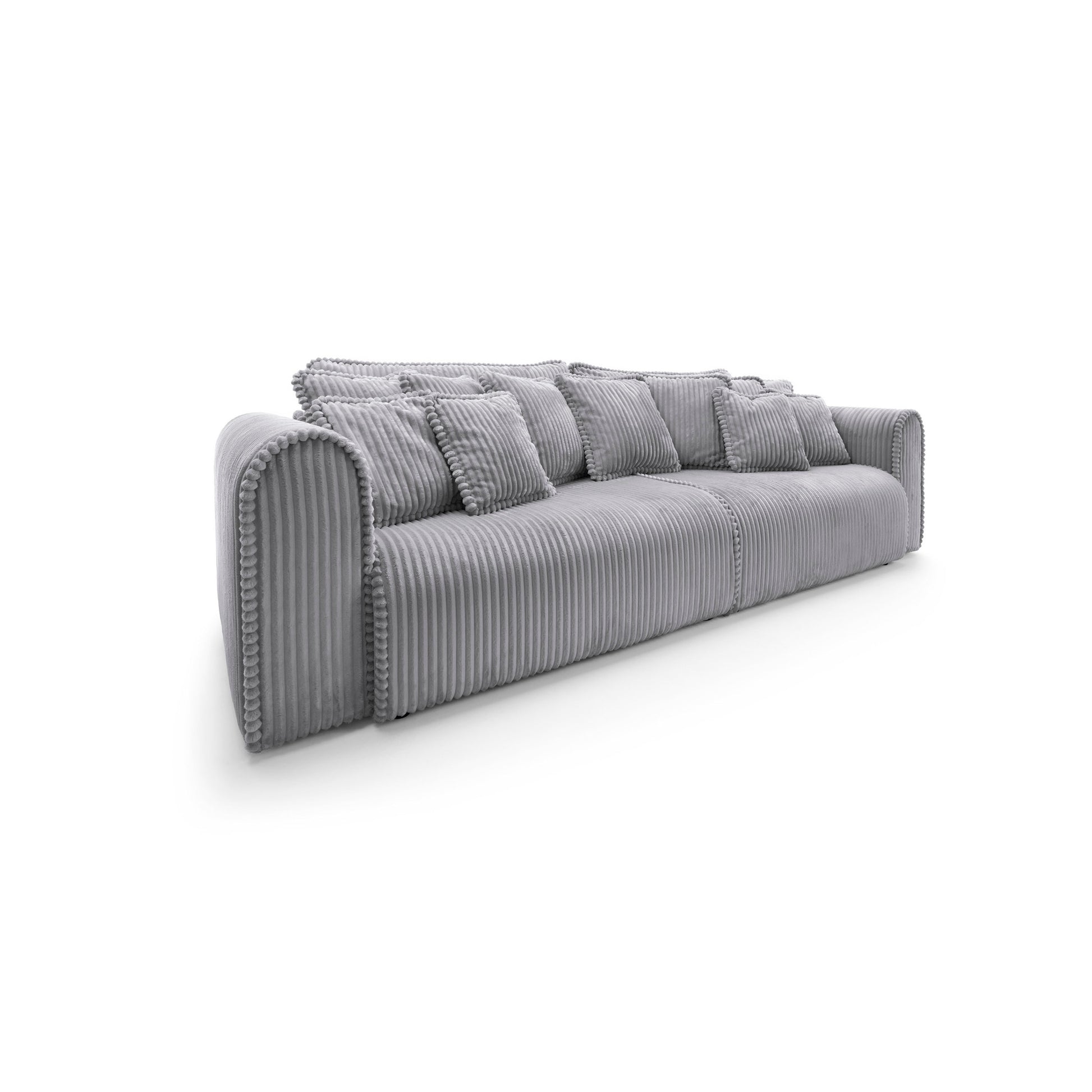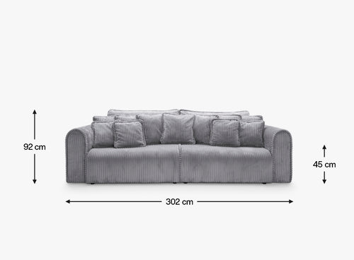 Big Buddy – sofa z funkcją spania i pojemnikiem na pościel to połączenie nowoczesnego designu, maksymalnej funkcjonalności i nieprzeciętnego komfortu. Jej monumentalna forma (302 cm szerokości) od razu przyciąga wzrok, a zaokrąglone kształty i pionowe przeszycia nadają jej stylowego, przytulnego charakteru. Tapicerowana sztruksem Tilia 90 – tkaniną o wysokiej odporności na ścieranie (90 000–100 000 cykli Martindale’a) i przyjazną zwierzętom – świetnie sprawdza się w codziennym użytkowaniu.