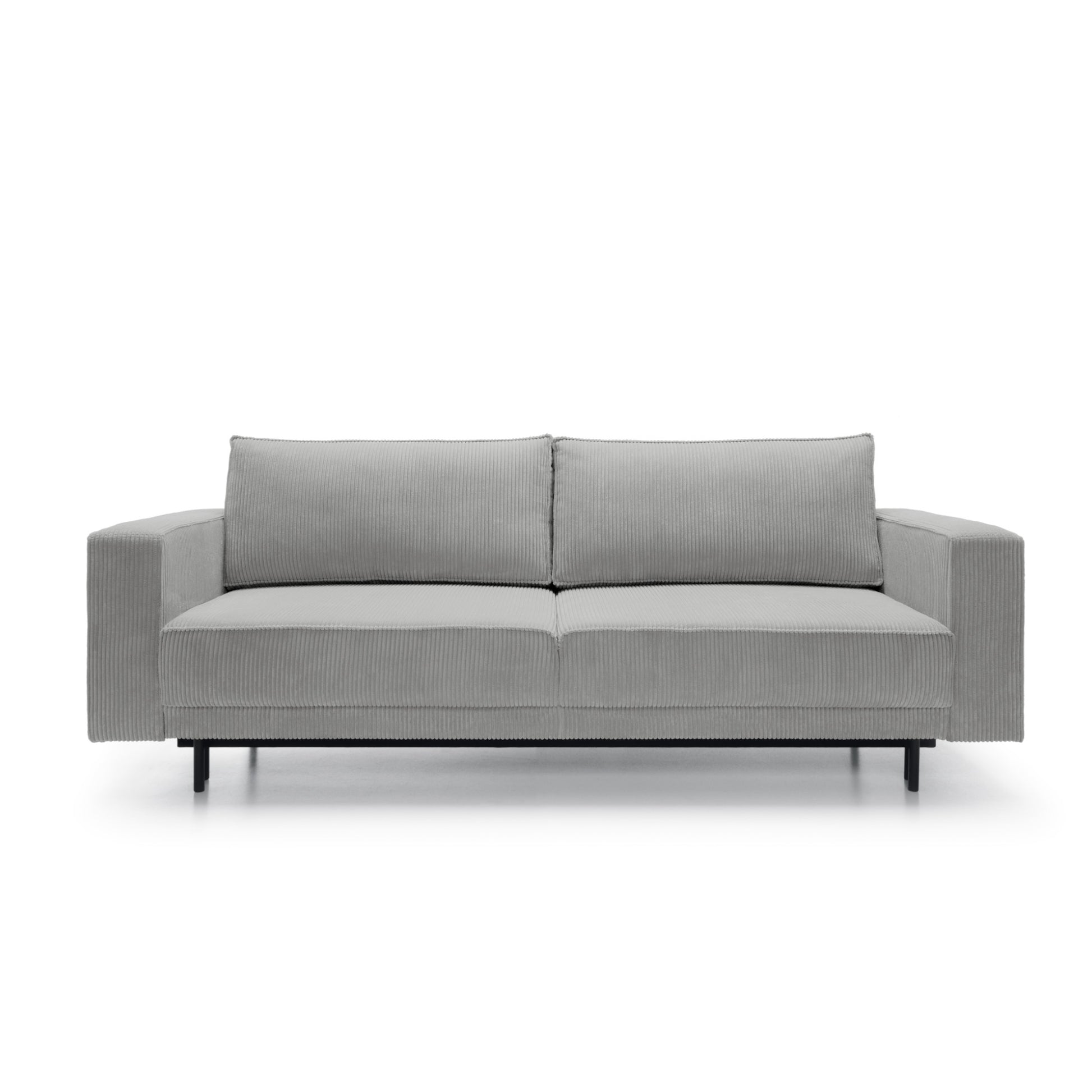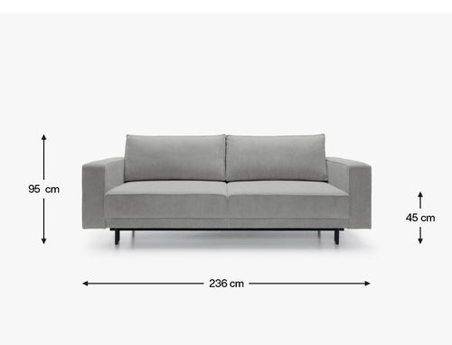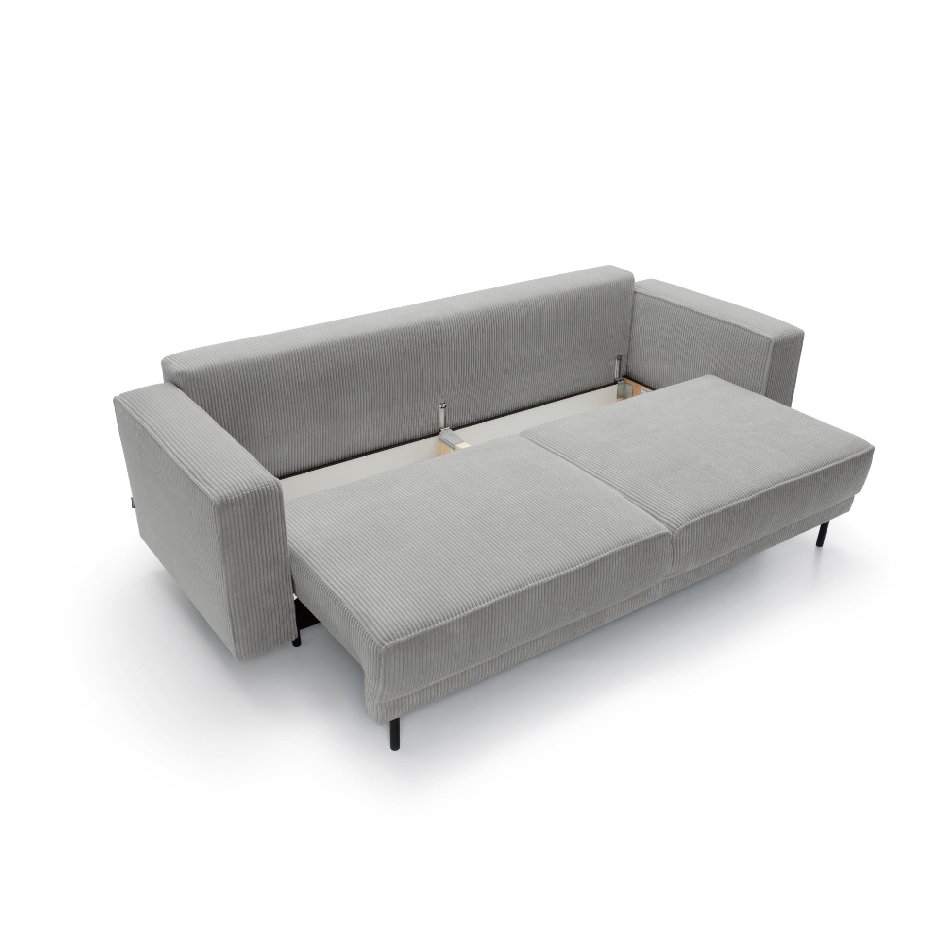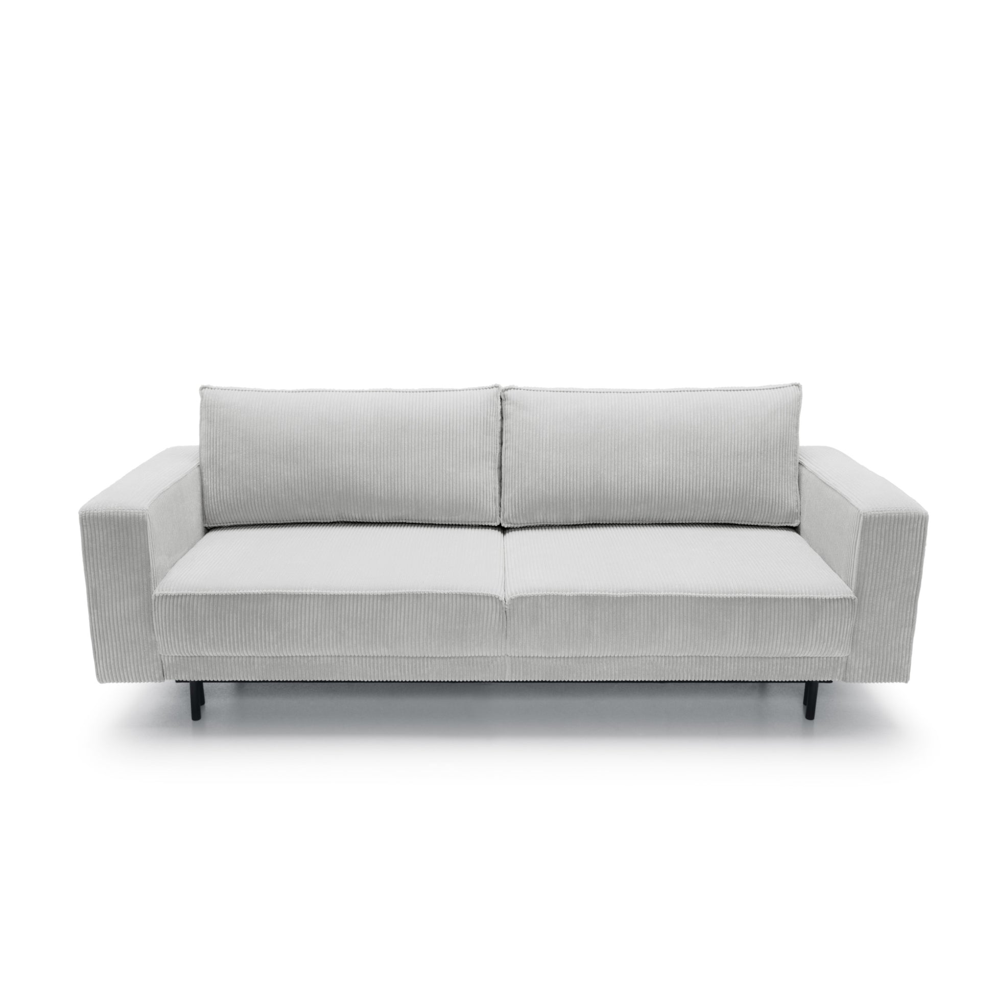 Sofa została wyposażona w funkcję spania z intuicyjnym mechanizmem DL, umożliwiającym szybkie i bezproblemowe rozłożenie. Wystarczy delikatnie wysunąć siedzisko i opuścić oparcie, aby uzyskać przestronną powierzchnię do wypoczynku. Dodatkowym atutem jest pojemny schowek na pościel, ukryty pod siedziskiem, który pozwala na wygodne przechowywanie kołder, poduszek czy koców, pomagając zachować porządek w salonie.