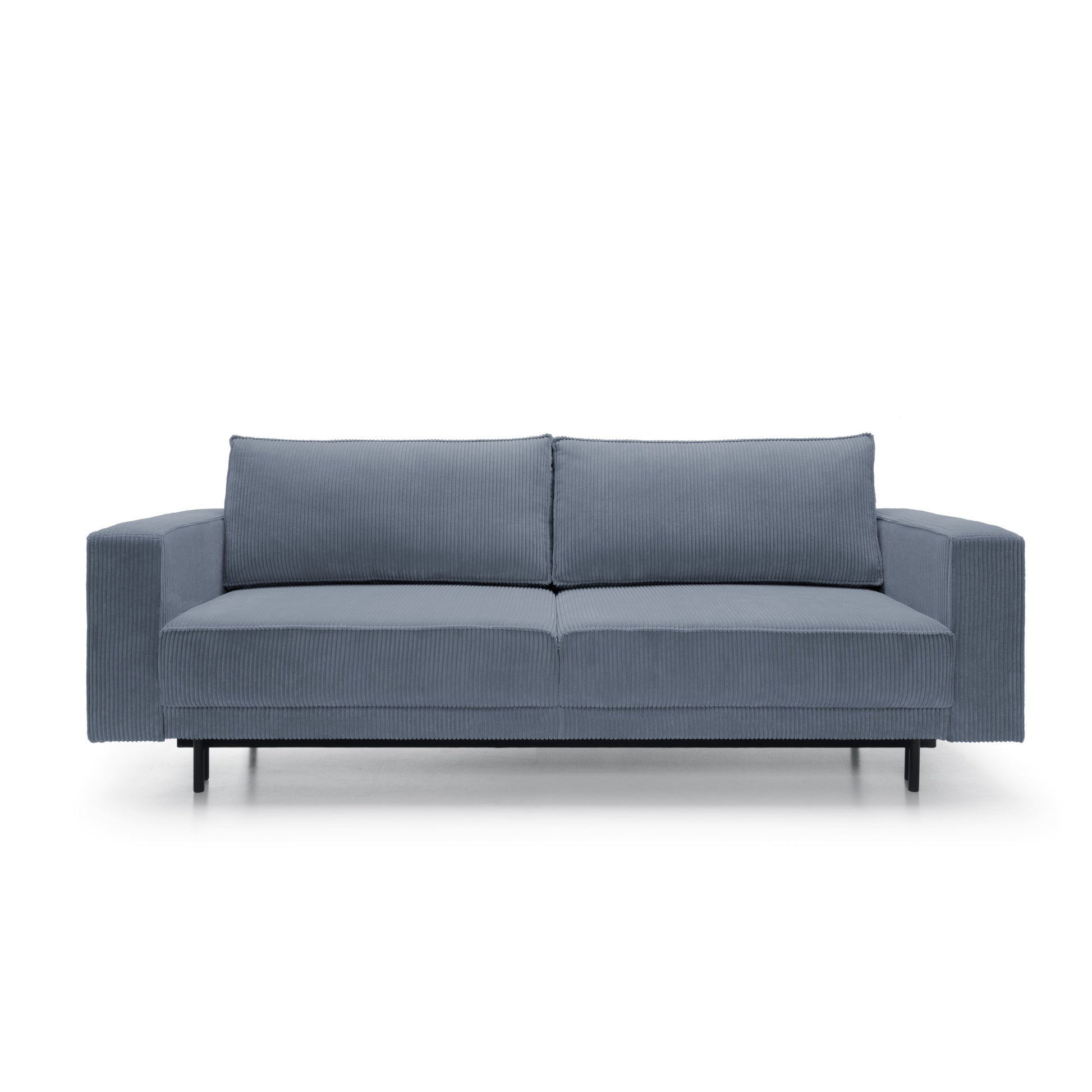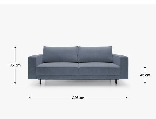 Sofa została wyposażona w funkcję spania z intuicyjnym mechanizmem DL, umożliwiającym szybkie i bezproblemowe rozłożenie. Wystarczy delikatnie wysunąć siedzisko i opuścić oparcie, aby uzyskać przestronną powierzchnię do wypoczynku. Dodatkowym atutem jest pojemny schowek na pościel, ukryty pod siedziskiem, który pozwala na wygodne przechowywanie kołder, poduszek czy koców, pomagając zachować porządek w salonie.