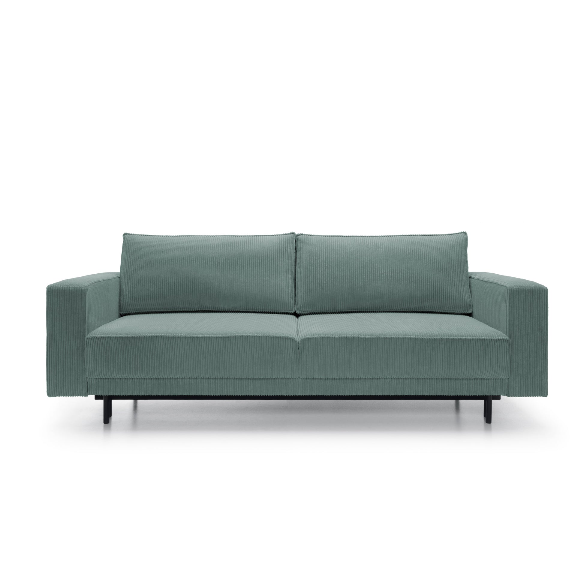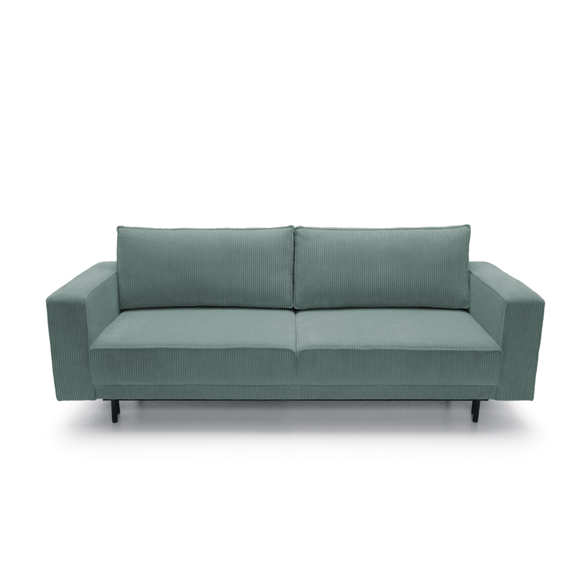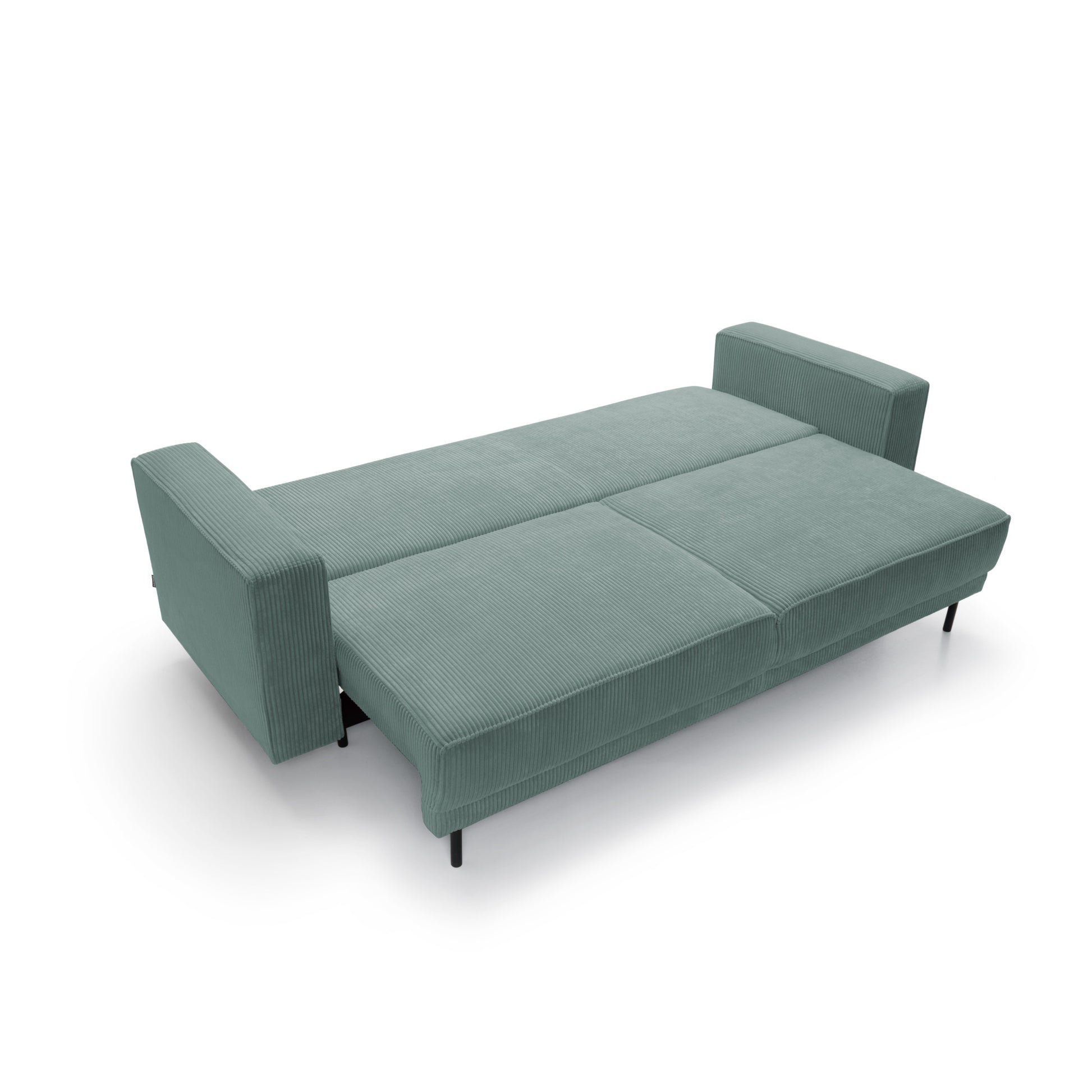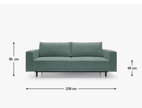 Sofa została wyposażona w funkcję spania z intuicyjnym mechanizmem DL, umożliwiającym szybkie i bezproblemowe rozłożenie. Wystarczy delikatnie wysunąć siedzisko i opuścić oparcie, aby uzyskać przestronną powierzchnię do wypoczynku. Dodatkowym atutem jest pojemny schowek na pościel, ukryty pod siedziskiem, który pozwala na wygodne przechowywanie kołder, poduszek czy koców, pomagając zachować porządek w salonie.