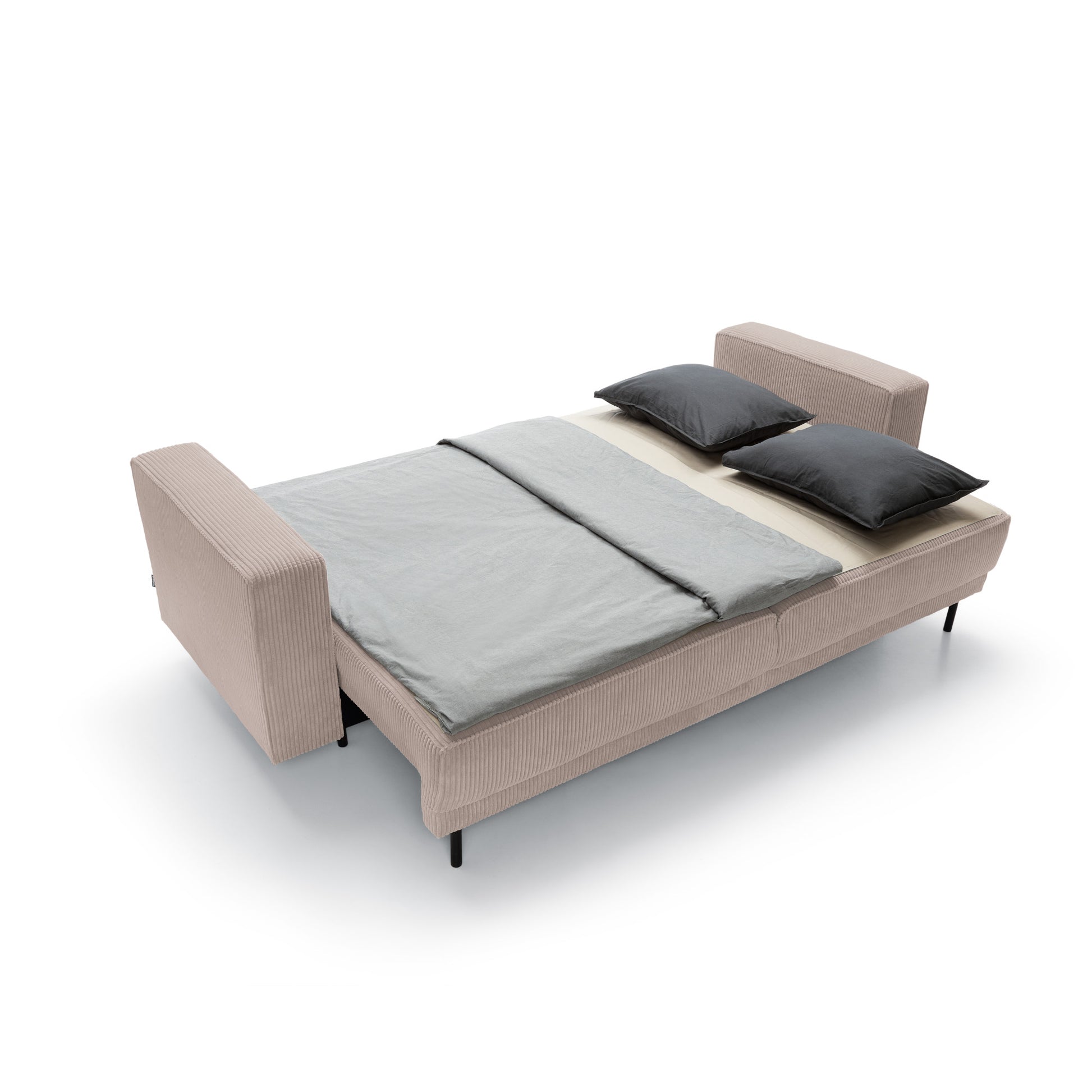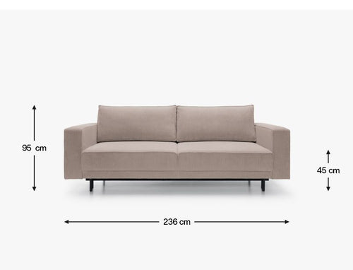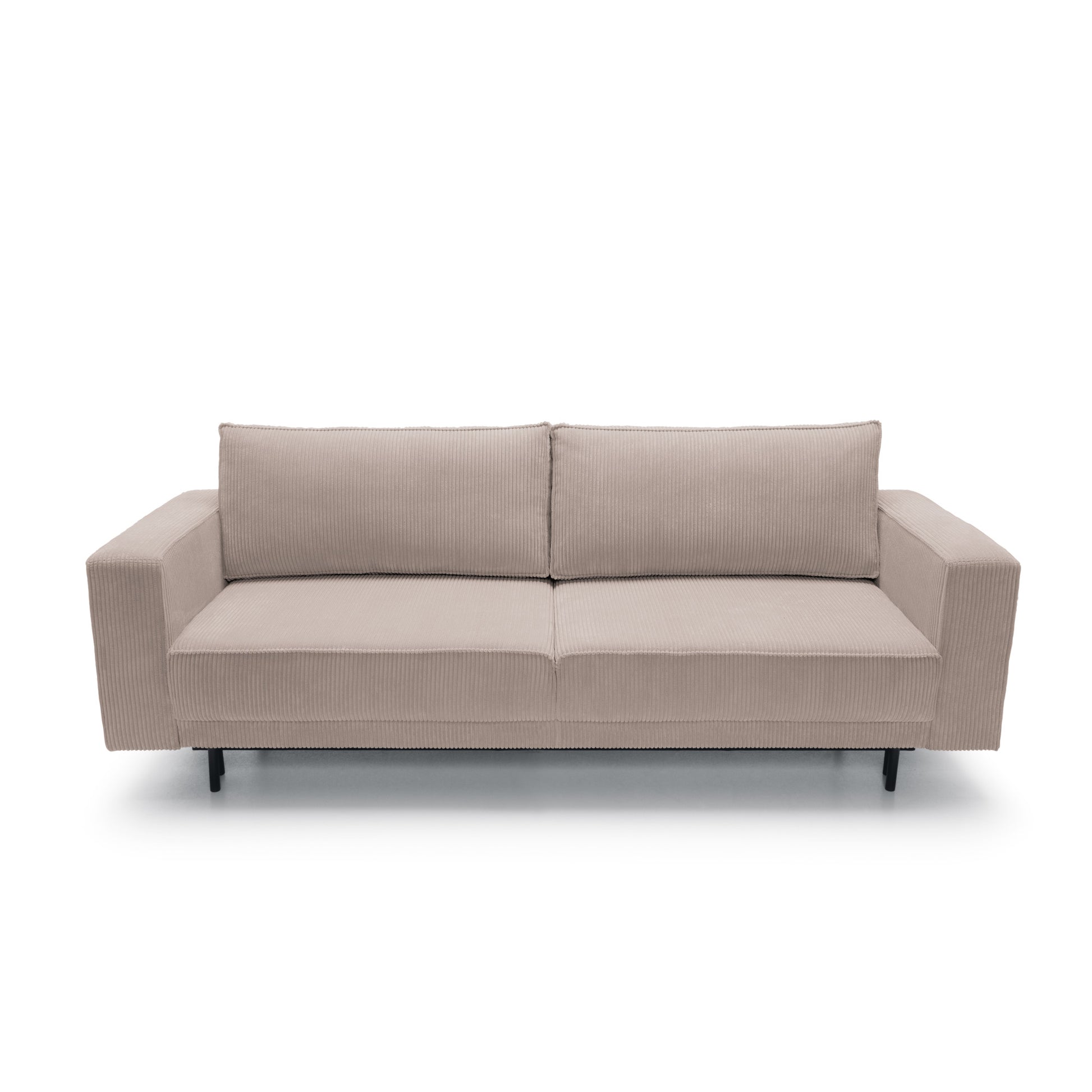 Sofa została wyposażona w funkcję spania z intuicyjnym mechanizmem DL, umożliwiającym szybkie i bezproblemowe rozłożenie. Wystarczy delikatnie wysunąć siedzisko i opuścić oparcie, aby uzyskać przestronną powierzchnię do wypoczynku. Dodatkowym atutem jest pojemny schowek na pościel, ukryty pod siedziskiem, który pozwala na wygodne przechowywanie kołder, poduszek czy koców, pomagając zachować porządek w salonie.