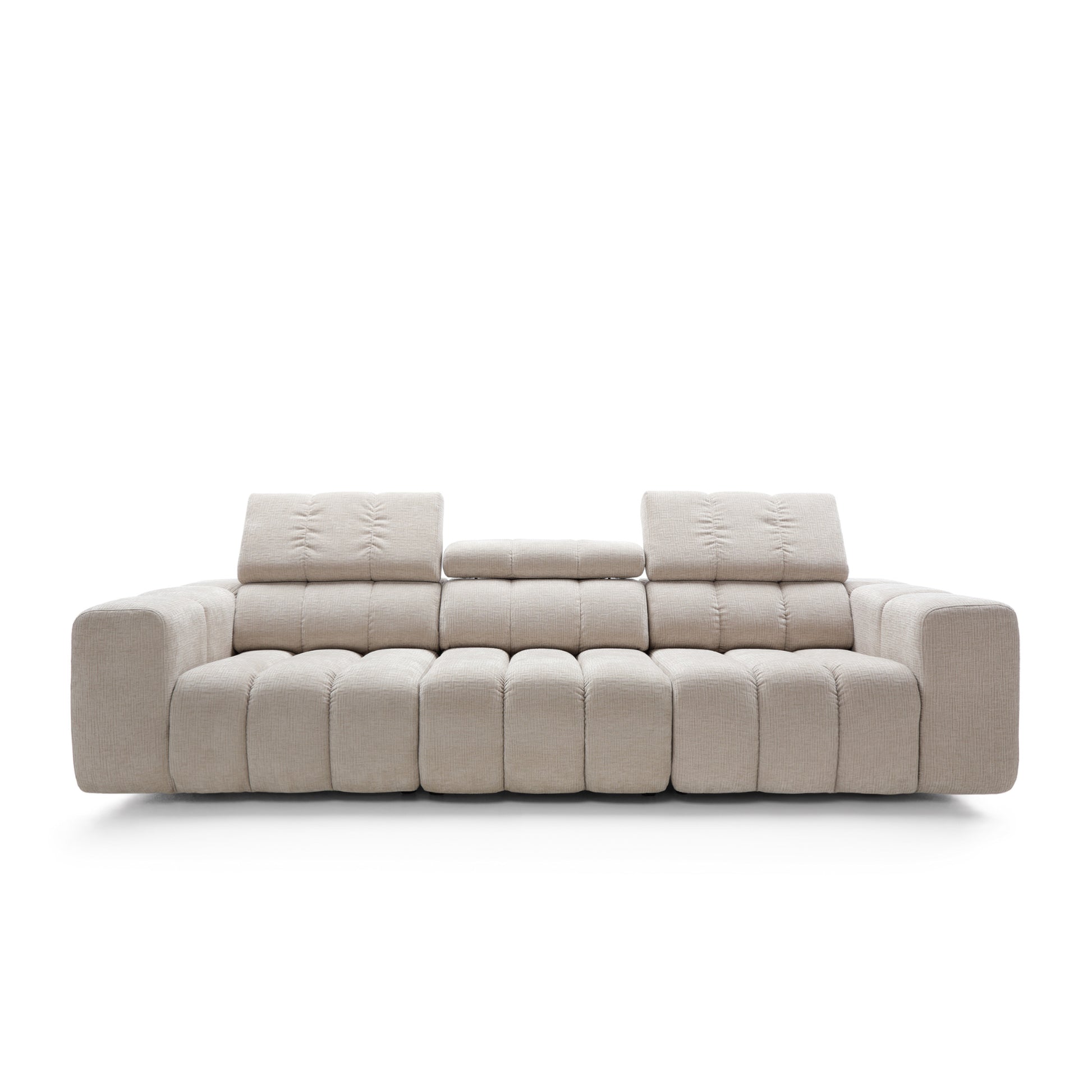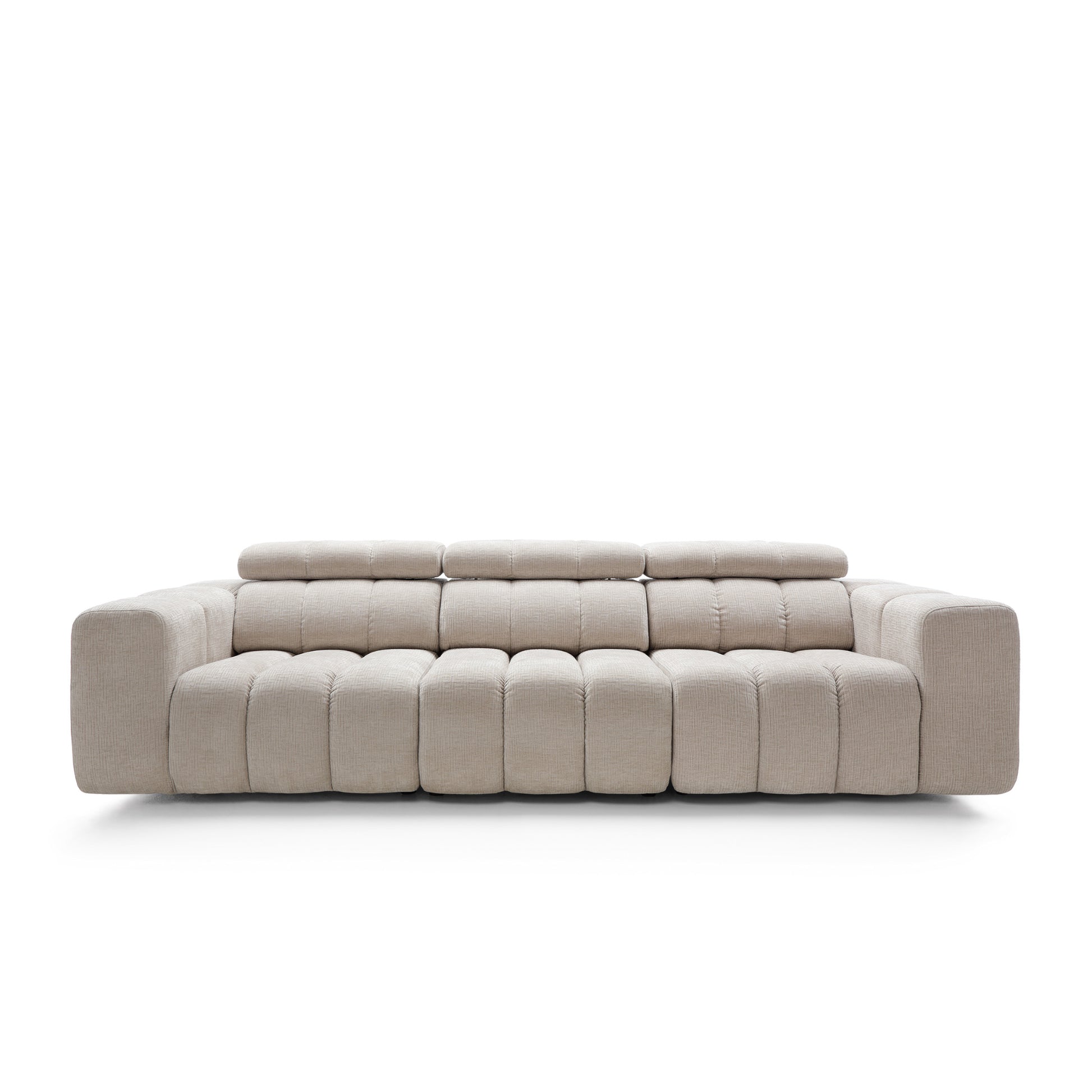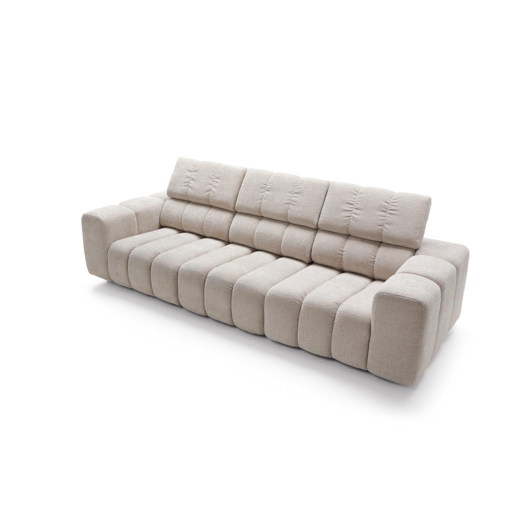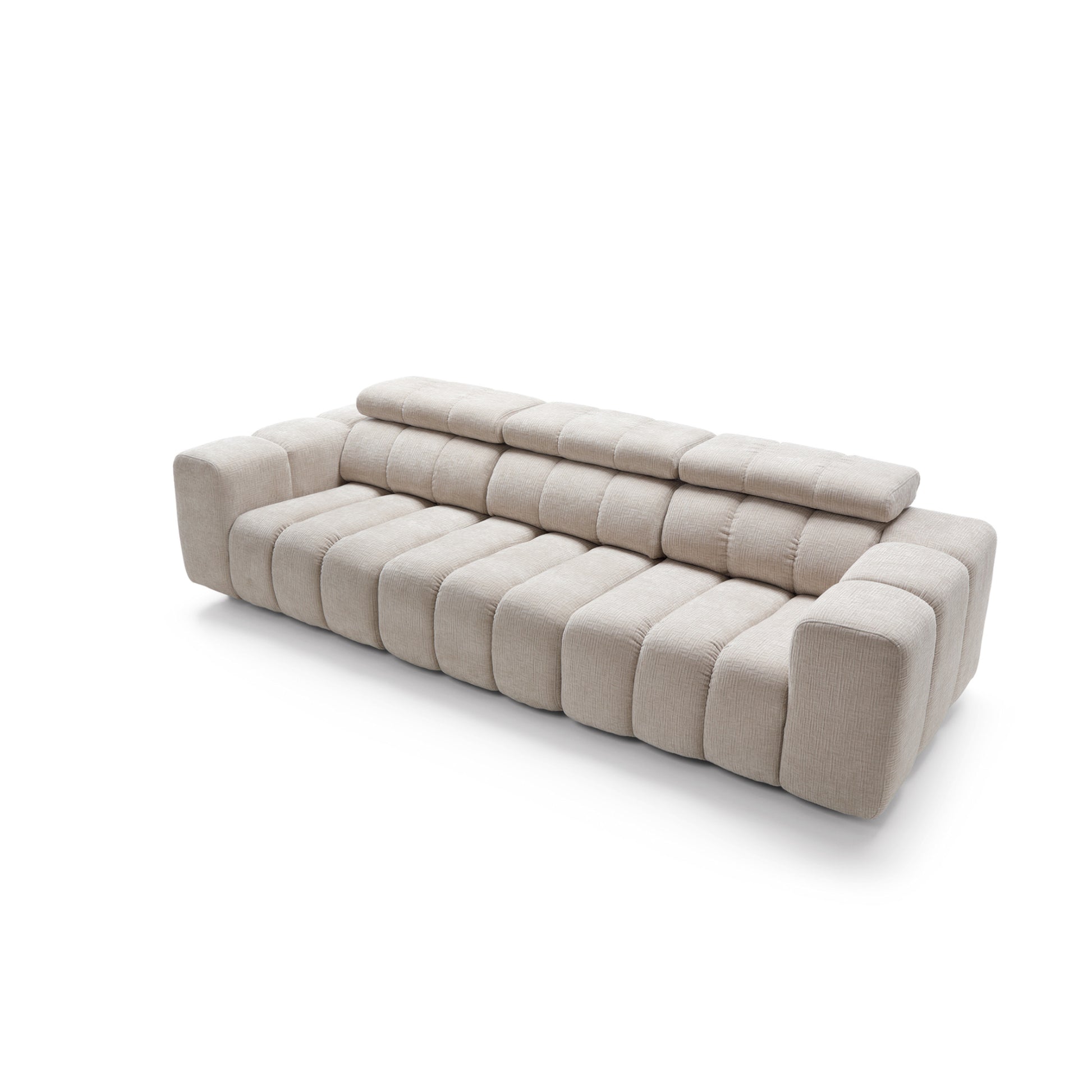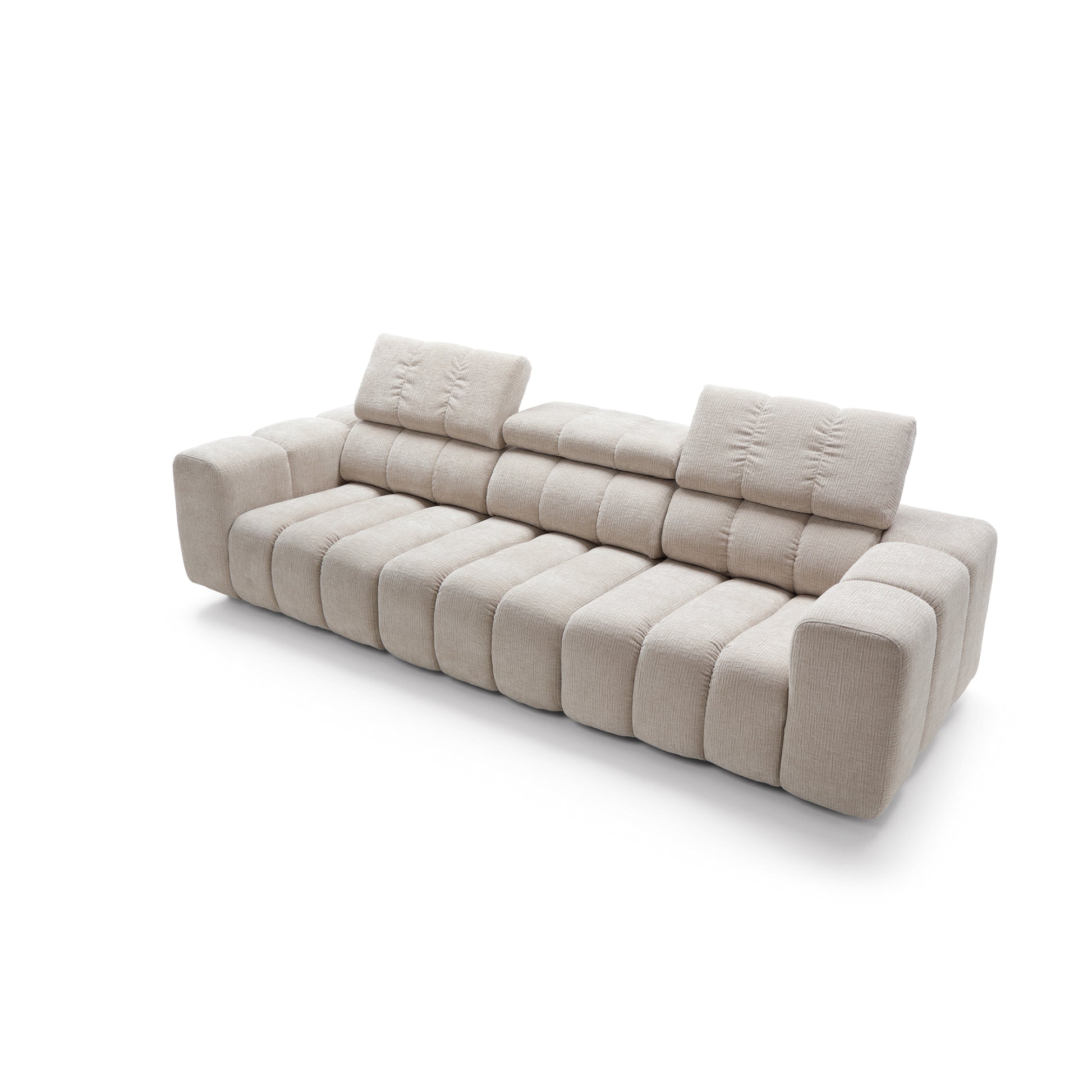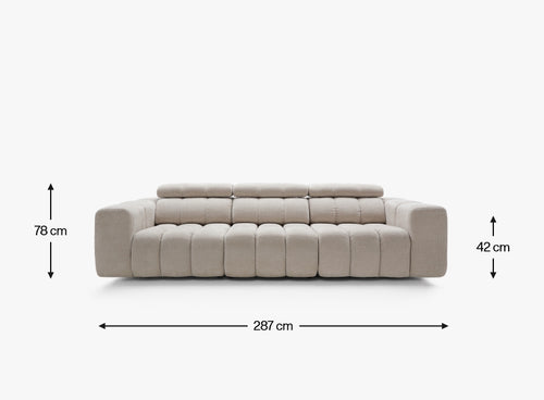 Regulowane zagłówki pozwalają na dopasowanie pozycji do indywidualnych potrzeb – od chwili czytania, po wieczór z filmem. Całość opiera się na niskich, subtelnych nóżkach (3 cm), które nadają sofie lekkości mimo jej imponujących wymiarów (287 × 113 cm).