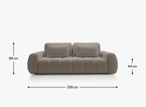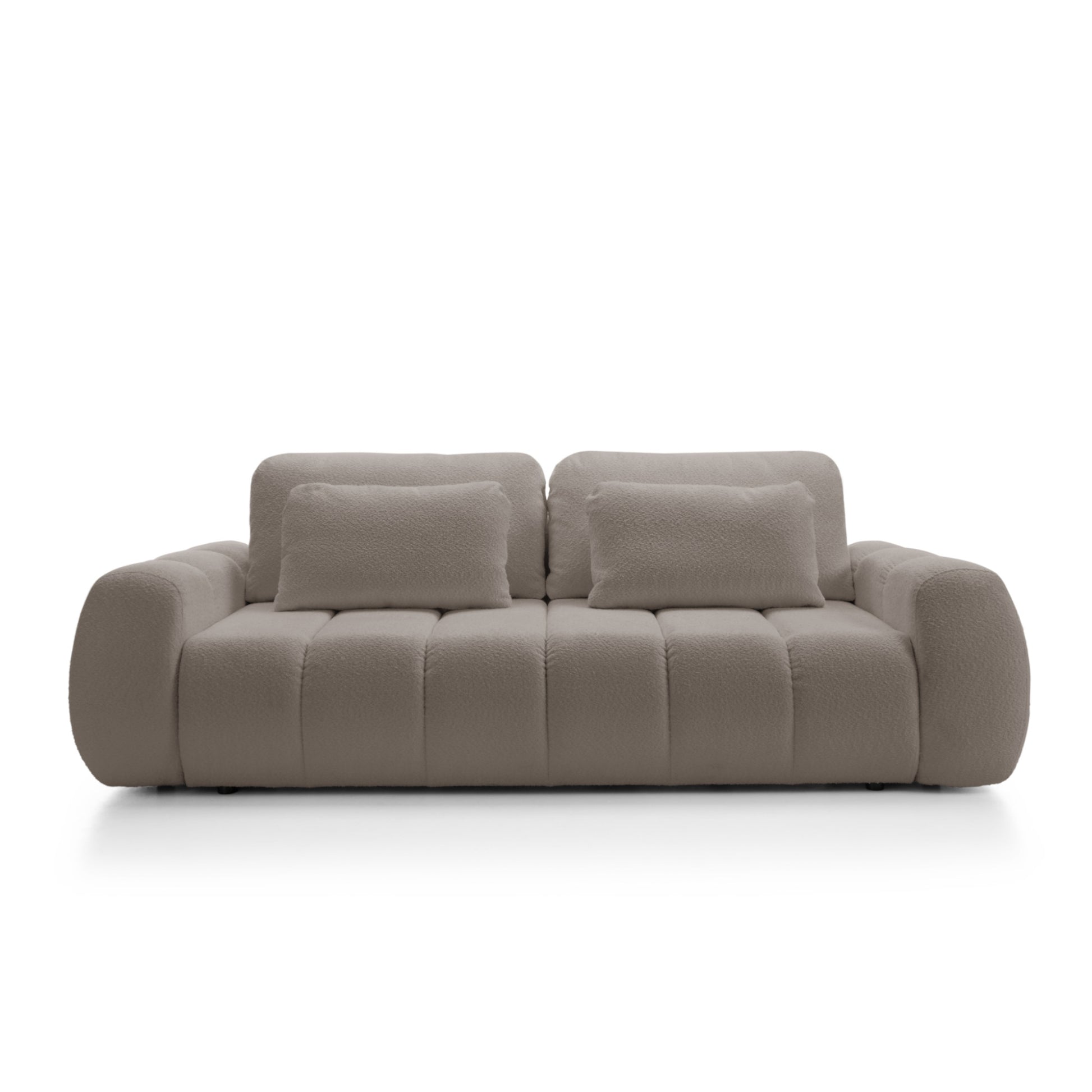 Charakteryzuje się obłymi kształtami i pełnymi, zaokrąglonymi podłokietnikami, które nadają jej przytulny i harmonijny wygląd. Sofa posiada wygodne, pikowane siedzisko podzielone na symetryczne segmenty, co podkreśla jej elegancką formę i dodaje struktury. Dwie duże poduszki oparcia zapewniają komfort i estetyczną spójność, idealnie komponując się z resztą konstrukcji.