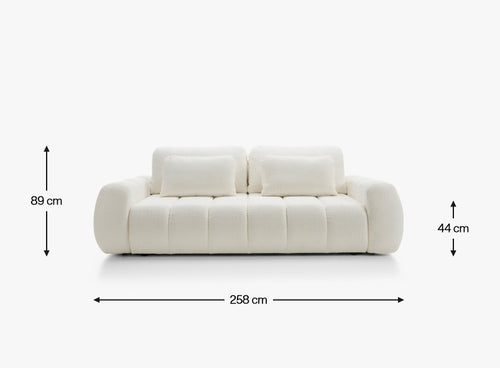 Charakteryzuje się obłymi kształtami i pełnymi, zaokrąglonymi podłokietnikami, które nadają jej przytulny i harmonijny wygląd. Sofa posiada wygodne, pikowane siedzisko podzielone na symetryczne segmenty, co podkreśla jej elegancką formę i dodaje struktury. Dwie duże poduszki oparcia zapewniają komfort i estetyczną spójność, idealnie komponując się z resztą konstrukcji.