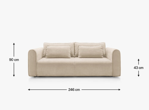 Przy szerokości 246 cm, wysokości 90 cm i głębokości 110 cm, Munro stanowi idealne centrum strefy relaksu. Szerokie siedzisko (198 cm) i ergonomiczna wysokość oparcia (73 cm) zapewniają komfort, który docenisz zarówno podczas codziennego odpoczynku, jak i dłuższych spotkań z bliskimi.