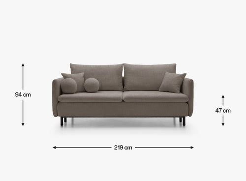 Szerokie, wygodne siedzisko zaprasza do relaksu, a obszerne poduszki oparcia gwarantują maksymalny komfort. Dodatkowym atutem są dekoracyjne poduszki w różnych kształtach, które nadają sofie unikalnego wyglądu, wprowadzając element zabawy do jej stonowanej, eleganckiej formy.