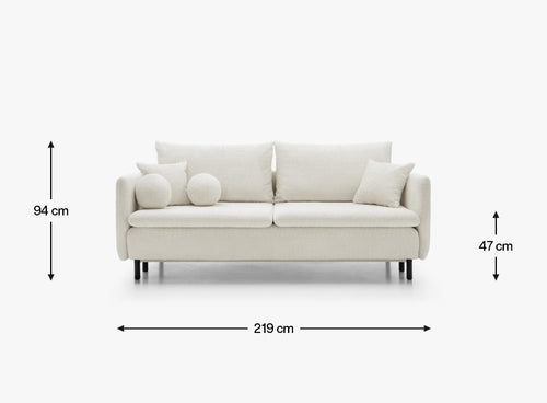 Szerokie, wygodne siedzisko zaprasza do relaksu, a obszerne poduszki oparcia gwarantują maksymalny komfort. Dodatkowym atutem są dekoracyjne poduszki w różnych kształtach, które nadają sofie unikalnego wyglądu, wprowadzając element zabawy do jej stonowanej, eleganckiej formy.