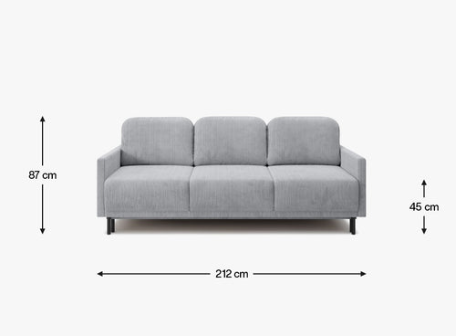 Delikatnie zaokrąglone oparcia i smukłe podłokietniki nadają sofie lekkości, a pionowe przeszycia podkreślają fakturę miękkiego materiału, który nie tylko świetnie wygląda, ale też otula przyjemnym ciepłem. Trzy wyraźnie zarysowane moduły siedziska i oparcia tworzą harmonijną, spójną kompozycję, zapraszając do wypoczynku – solo lub w towarzystwie.