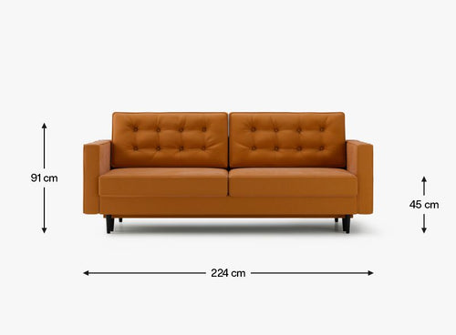 Prosta, harmonijna linia mebla podkreślona jest przez subtelne pikowania na oparciu oraz staranne obszycia krawędzi, które nadają sofie wyjątkowego charakteru. Smukłe, wysokie nogi wykonane z naturalnego drewna dodają jej lekkości i podkreślają stylowy wygląd.