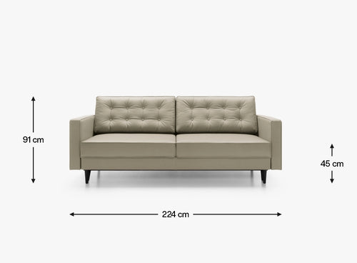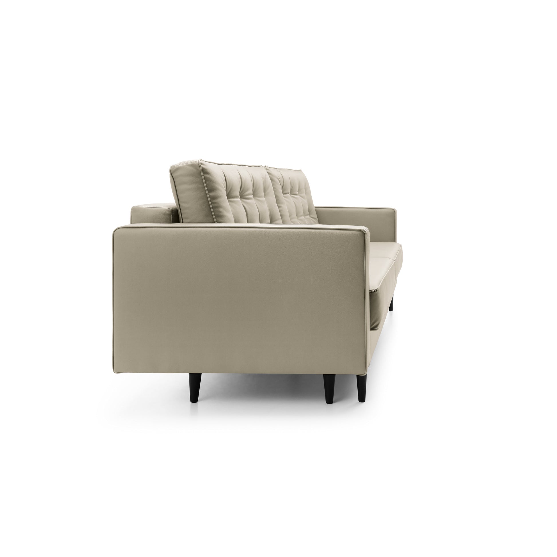 Prosta, harmonijna linia mebla podkreślona jest przez subtelne pikowania na oparciu oraz staranne obszycia krawędzi, które nadają sofie wyjątkowego charakteru. Smukłe, wysokie nogi wykonane z naturalnego drewna dodają jej lekkości i podkreślają stylowy wygląd.