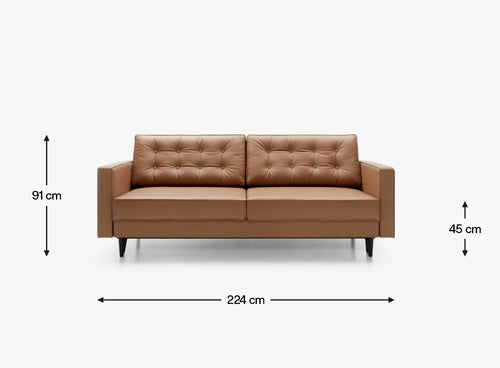 Prosta, harmonijna linia mebla podkreślona jest przez subtelne pikowania na oparciu oraz staranne obszycia krawędzi, które nadają sofie wyjątkowego charakteru. Smukłe, wysokie nogi wykonane z naturalnego drewna dodają jej lekkości i podkreślają stylowy wygląd.
