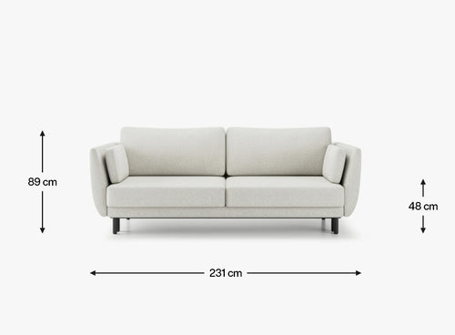 Przy szerokości 231 cm, wysokości 89 cm i głębokości 99 cm, Velma jest idealnym wyborem zarówno do przestronnych, jak i bardziej kompaktowych salonów. Szerokie siedzisko (198 cm) oraz wysokie podłokietniki (74 cm) zapewniają wygodę i solidne wsparcie, a wysokość siedziska 48 cm ułatwia komfortowe siadanie i wstawanie.