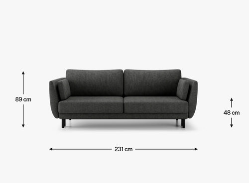Przy szerokości 231 cm, wysokości 89 cm i głębokości 99 cm, Velma jest idealnym wyborem zarówno do przestronnych, jak i bardziej kompaktowych salonów. Szerokie siedzisko (198 cm) oraz wysokie podłokietniki (74 cm) zapewniają wygodę i solidne wsparcie, a wysokość siedziska 48 cm ułatwia komfortowe siadanie i wstawanie.