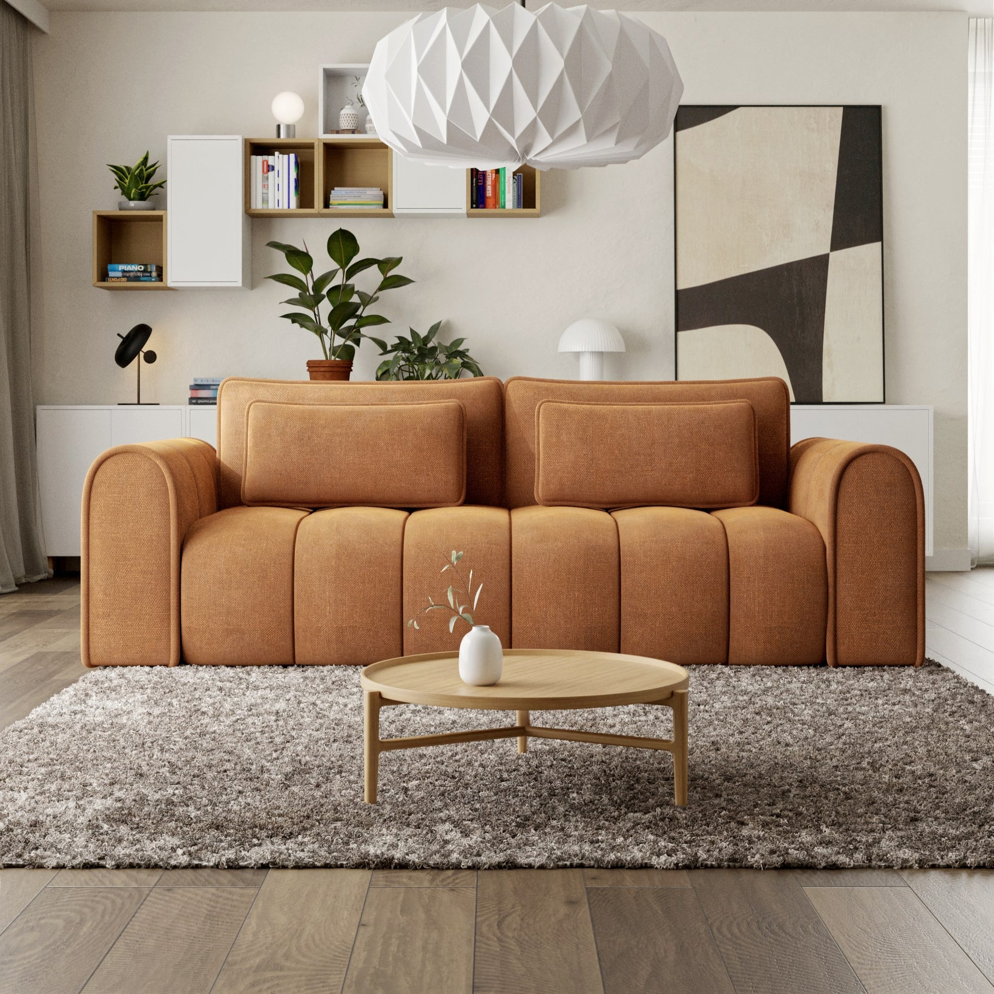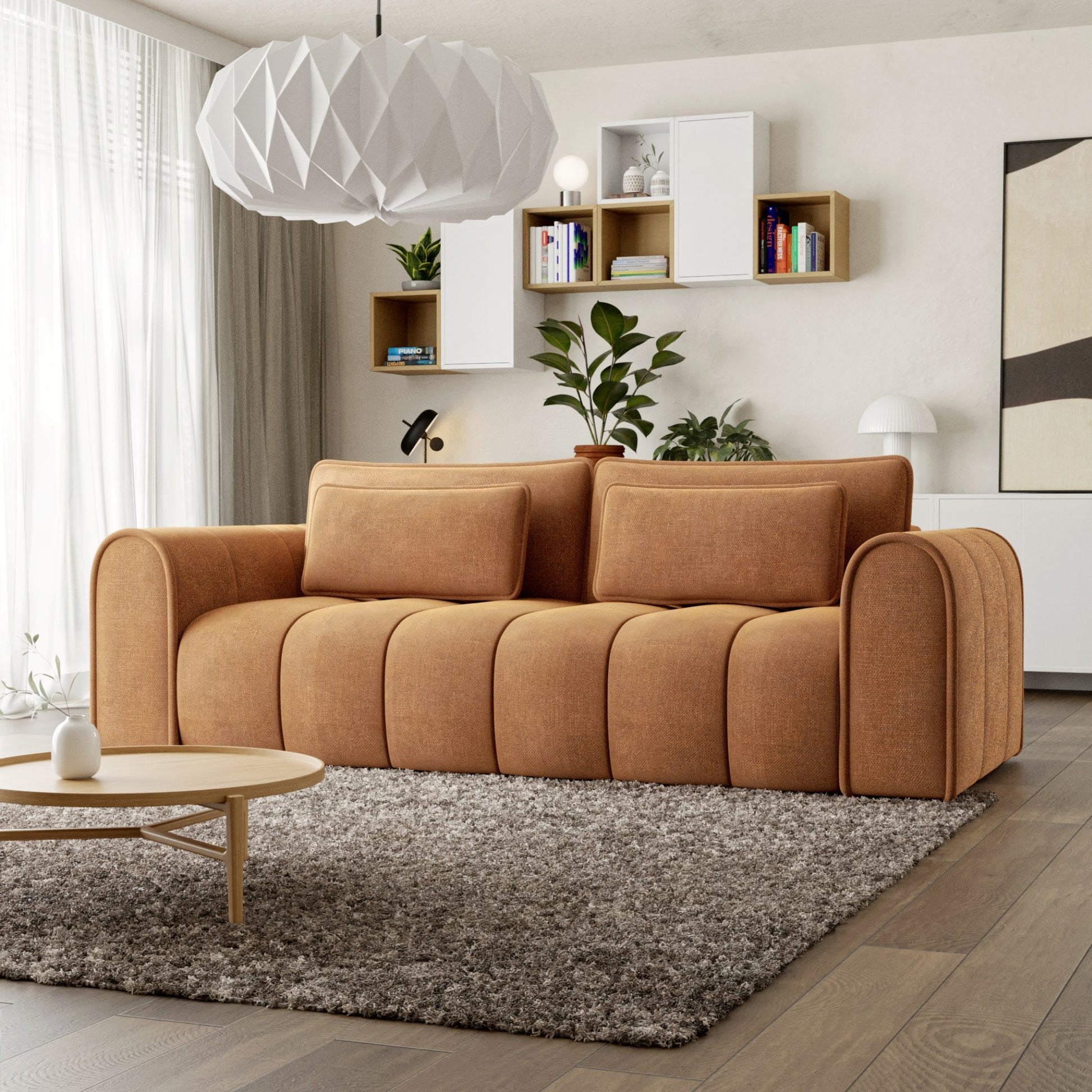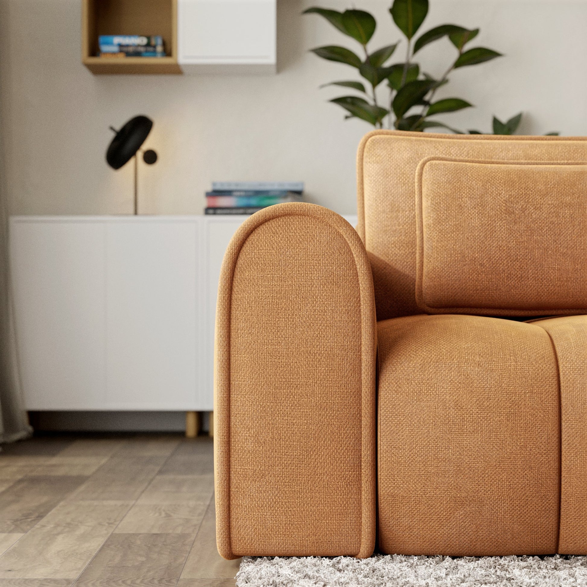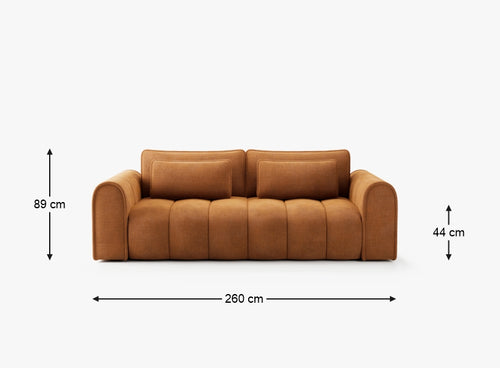 Masywna sofa 260 cm zachwyca zaoblonymi konturami i pionowymi przeszyciami, wprowadzając do wnętrza nowoczesną miękkość i przytulność. Tapicerka z tkaniny Rebel - miękkiej w dotyku, odpornej na ścieranie (80 000 cykli Martindale’a) – łączy elegancję z funkcjonalnością.