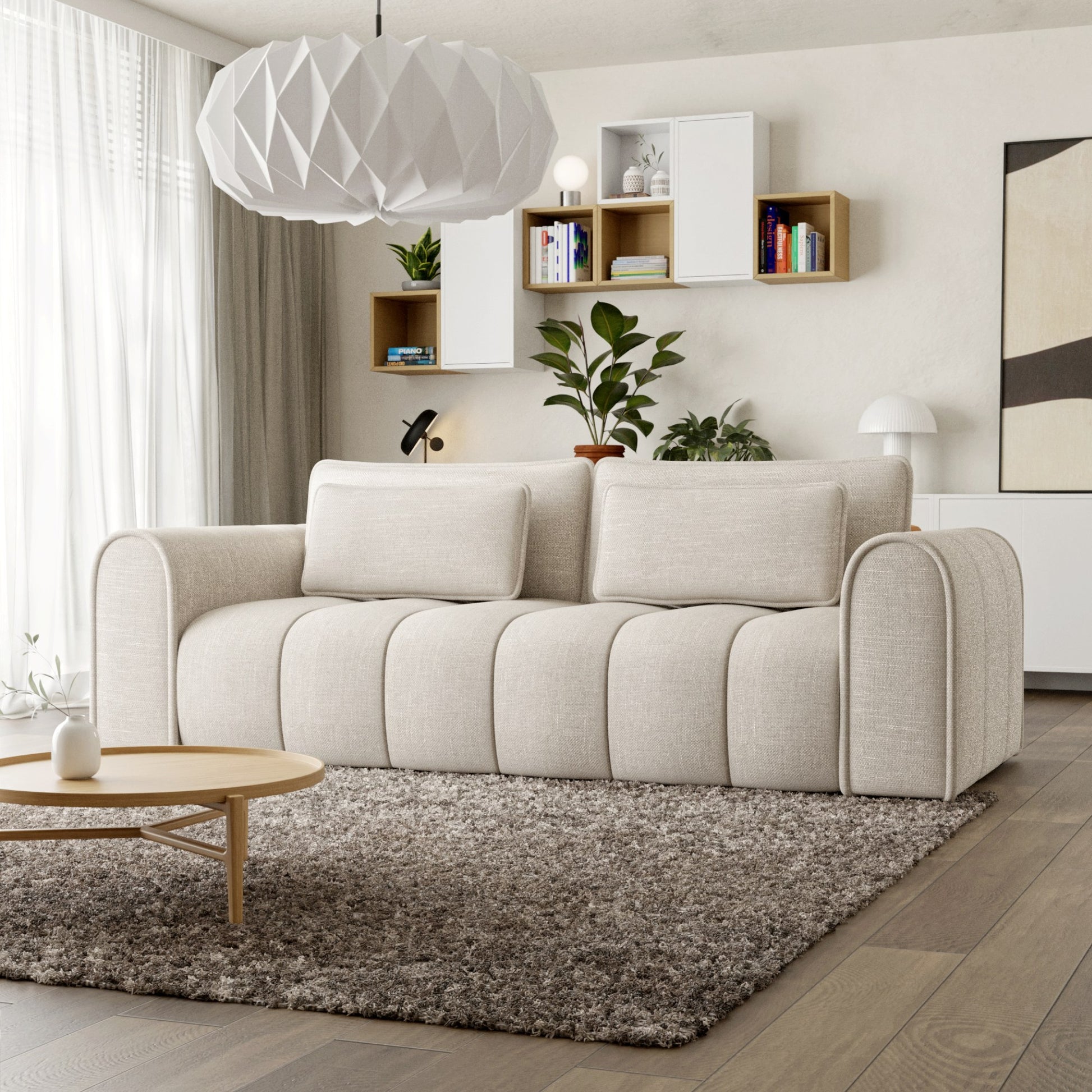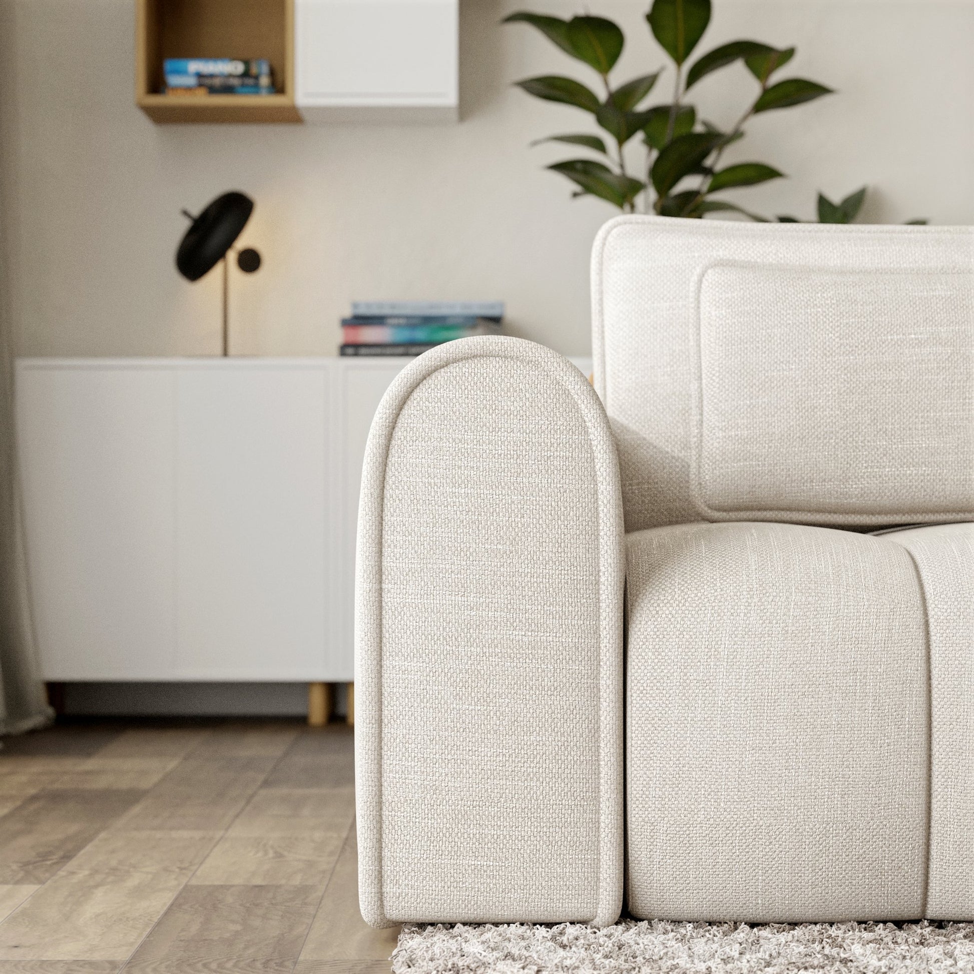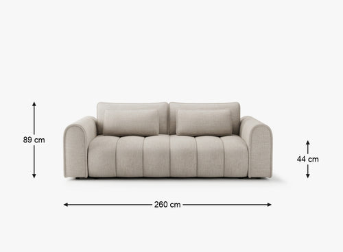 Masywna sofa 260 cm zachwyca zaoblonymi konturami i pionowymi przeszyciami, wprowadzając do wnętrza nowoczesną miękkość i przytulność. Tapicerka z tkaniny Rebel - miękkiej w dotyku, odpornej na ścieranie (80 000 cykli Martindale’a) – łączy elegancję z funkcjonalnością.